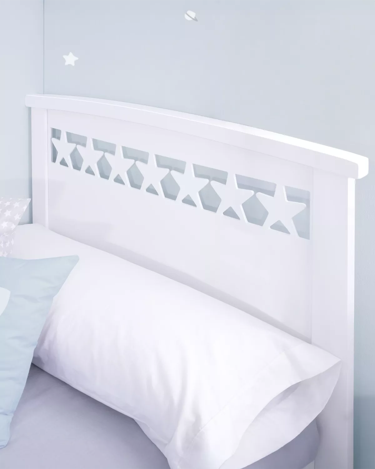 Testiera per bambini Stelle: è una bella testiera tutta decorata di stelline, una forma curva elegante, bella e in più ha una decorazione divertente e allegra. Fabbricata in legno di pino e DM, materiale forte, rigido e di lunga durata, con una bella finitura in bianco, colore facile da abbinare con qualsiasi stanza. Un oggetto di arredo di qualtà superiore perfetto per tutti i bambini.
