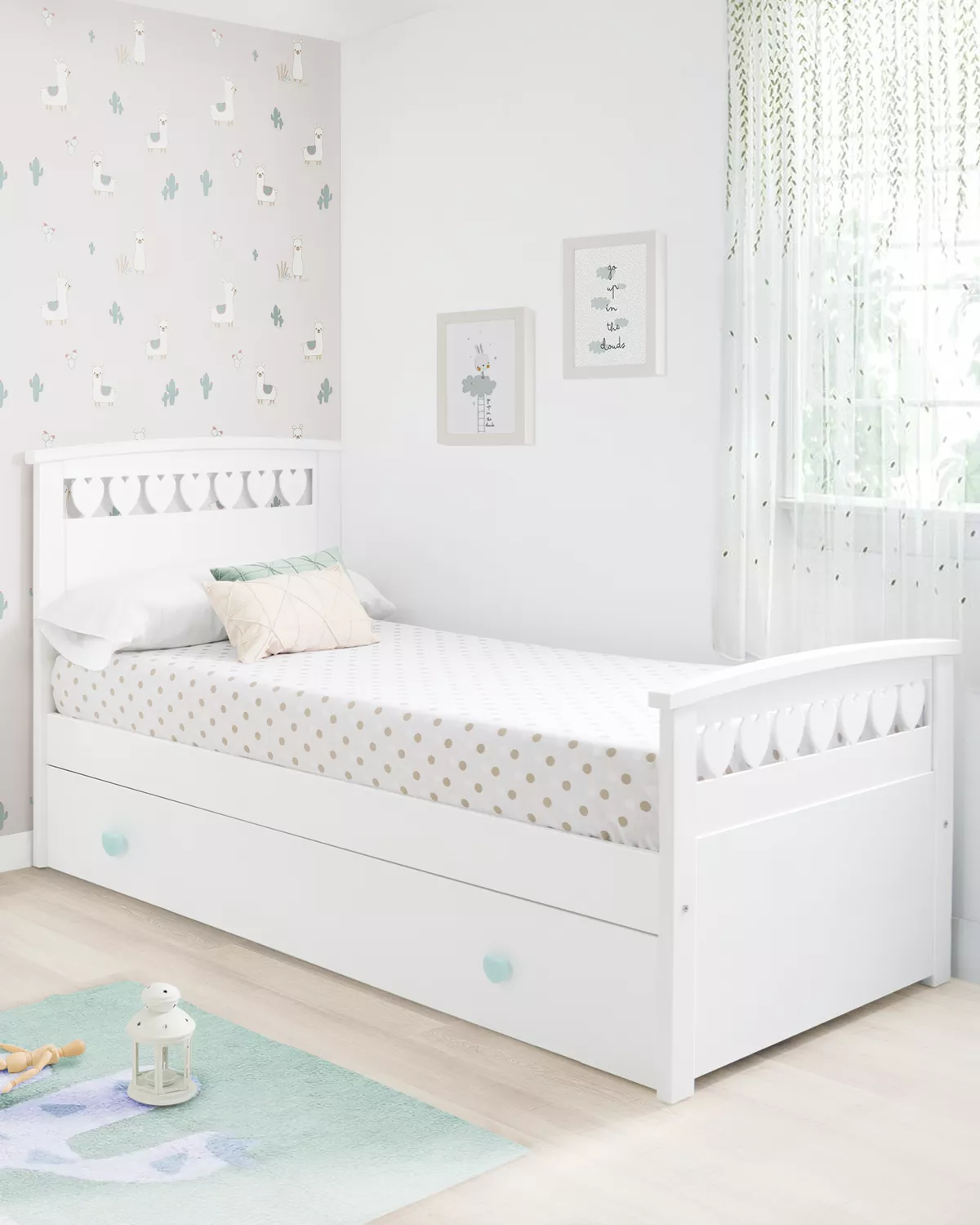 Letto per bambine estraibile Cuori è un bel lettino perfetto per le bambine, con una decorazione romantica e armoniosa di cuoricini che se ne possono trovare sulla testiera e la pediera- questo lettino farà della camera da letto un luogo tutto magico. Fabbricato in legno di pino e DM, materiale di gran qualità, resistenza e durabilità, essendo sicuramente una delle migliori opzioni per quelli che vogliano un mobile per tanti anni. Inoltre alla bellezza e la decorazione originale e divertente questo letto è anche molto funzionale perchè il letto estraibile è molto facile da utilizzare scorrendo soavente sulla terra; i suoi piedi pieghevoli cadono gentilmente appena si solleva un pò il peso del letto in modo che non è necessario nessun movimento forzoso o difficile.