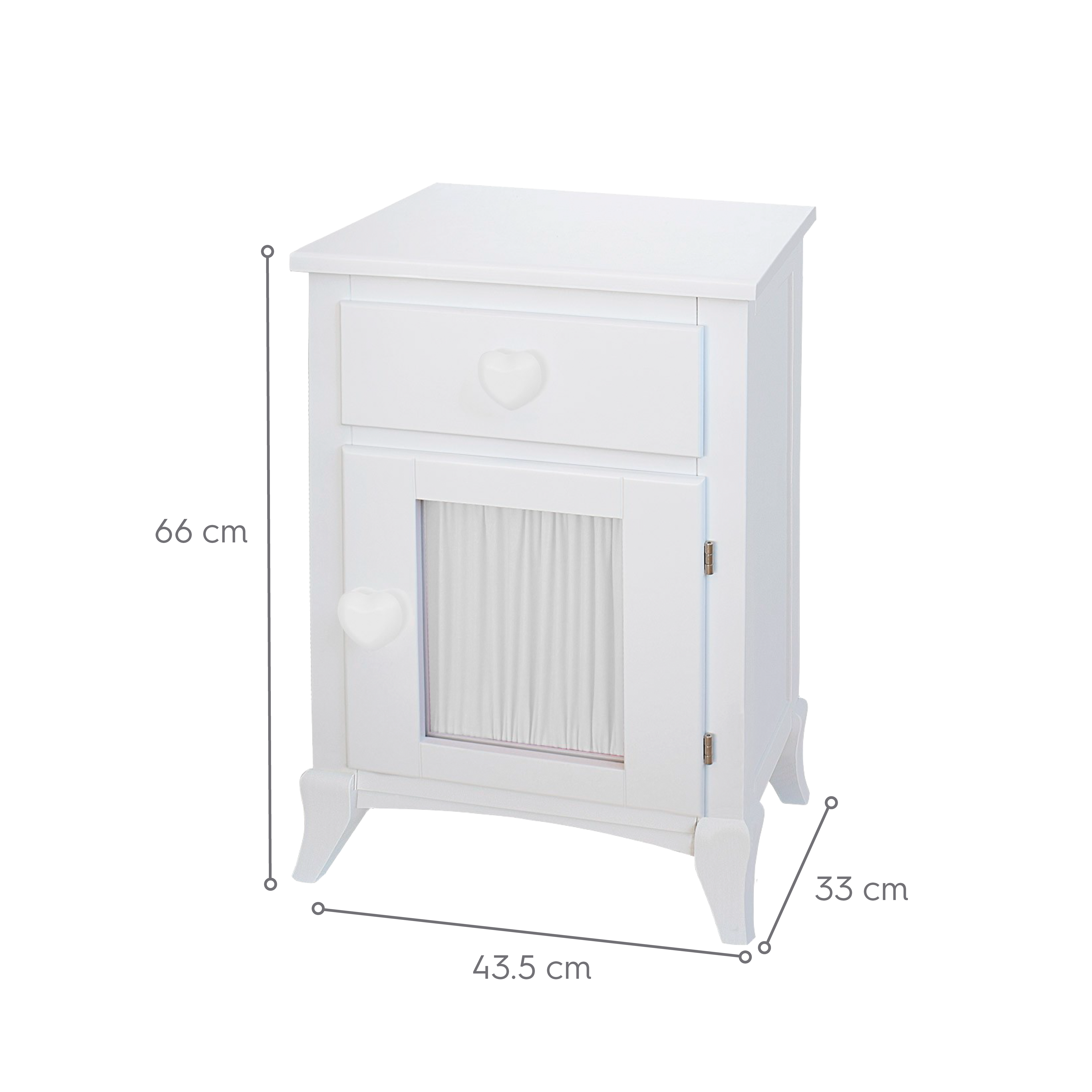 Il Comodino con anta e tende è un bel oggetto di decorazione che sarà il complemento ideale per la camera da letto dei bambini, messo vicino al letto è perfetto per metterci sopra una lampada per illuminare la stanza durante la notte o quando i bimbi vanno addormentarsi, i cassetti che ci sono possono essere molto utili per guardare tutti gli oggetti che loro hanno bisogno vicini. La tenda che può essere scelta nel colore rosa anche, porta gioia e un pò di colore alla cameretta. Questo piccolo mobile è stato fabbricato in legno di pino e MDF, materiale forte, resistente e molto durevole.
