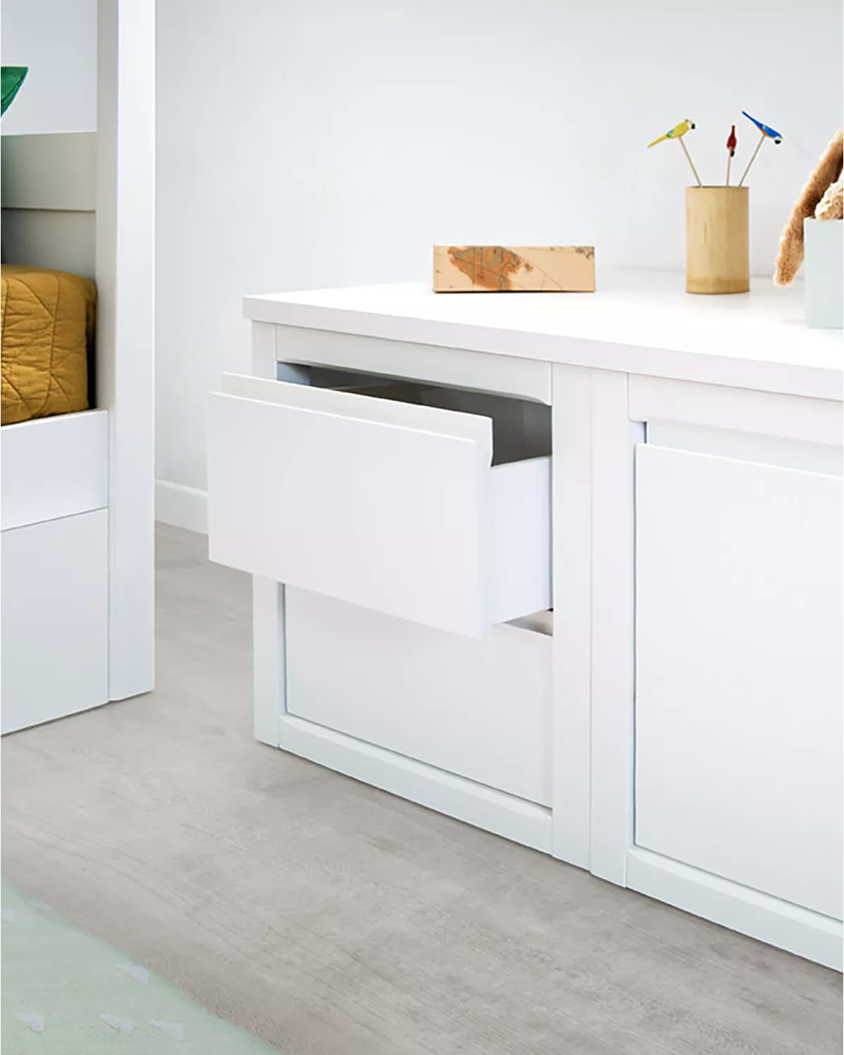 Con un disegno bello e originale, questa cassettiera con seduta si abbinerà perfettamente con tutti gli altri mobili della cameretta. Questo mobile può avere diversi cassetti molto capienti che serviranno per riordinare tutta la stanza. Inoltre, ha l'altezza giusta per poterci sedere sopra.