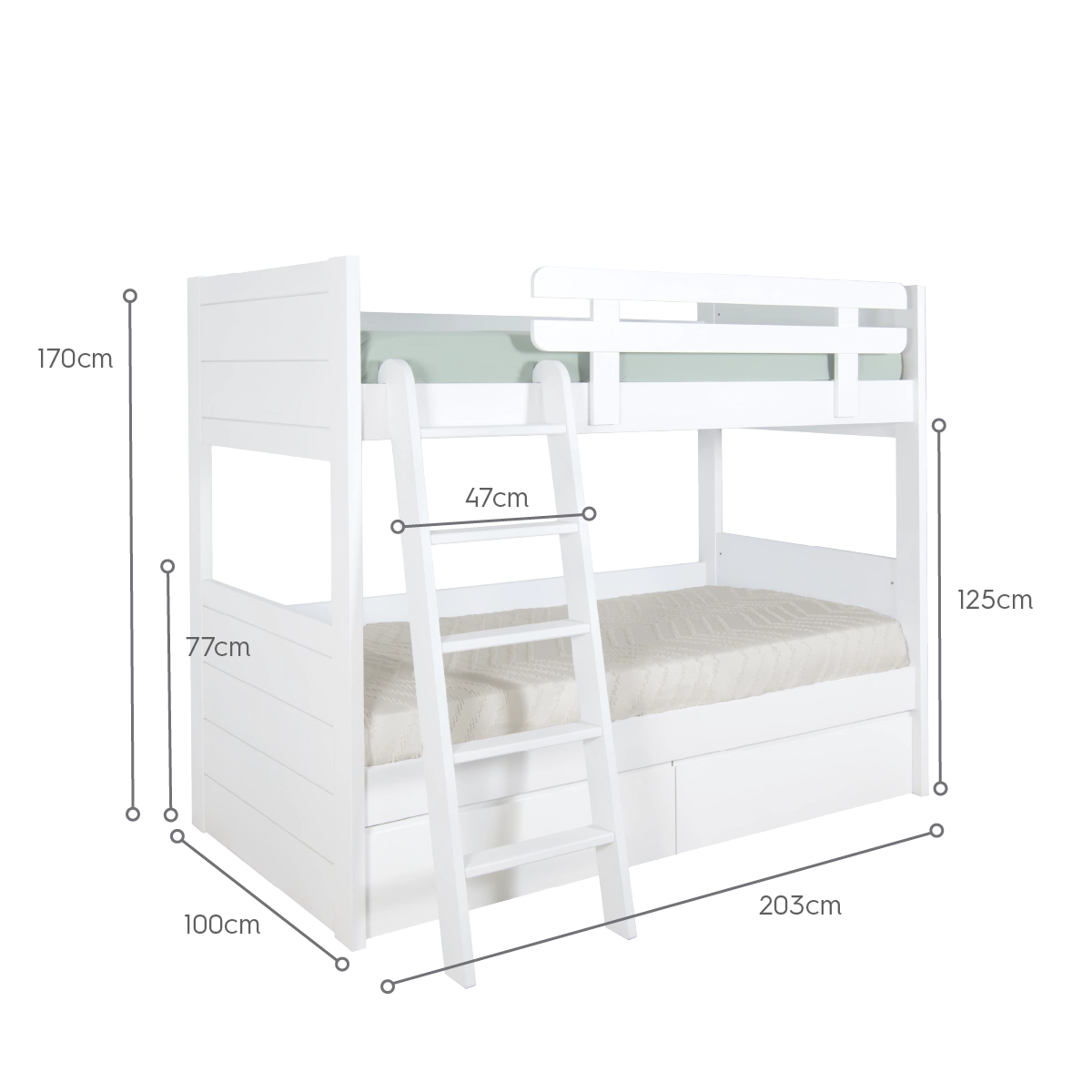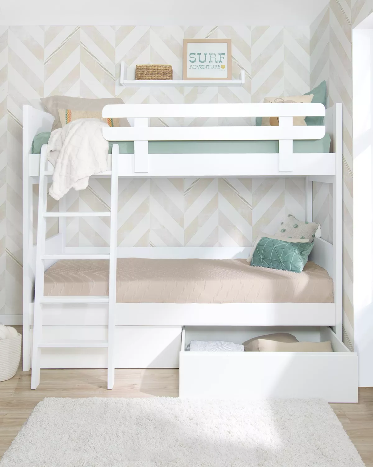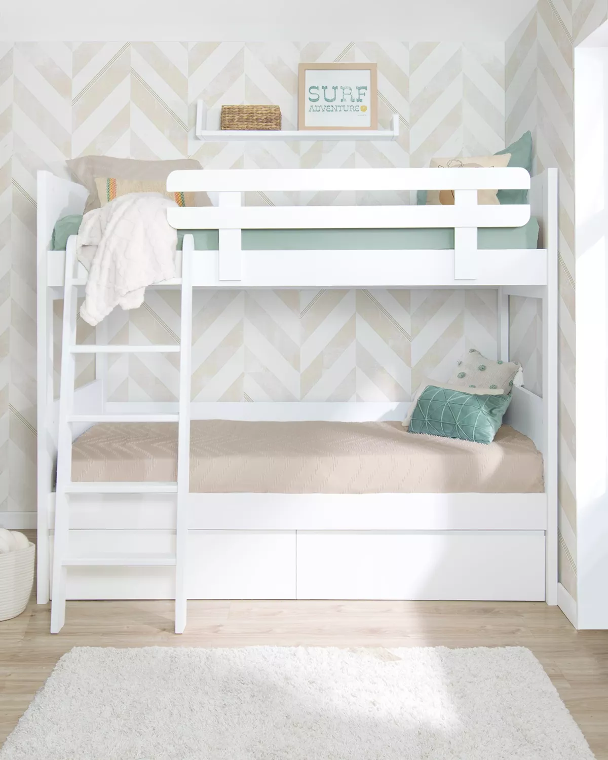Letto a castello con cassetti ideale per i bambini, laccato in bianco con qualità superiore: Il letto a castelllo è una opzione eccezionale per i fratellini o sorelline che hanno bisgono di condividere spazio, questo lettino oltre ad essere funzionale, perchè ce l’ha dei bei cassettoni sotto, capienti e molto comodi- darà un tocco speciale e elegante alla cameretta. Grazie alla sua struttura leggera però anche forte e robusta i vostri figli potranno utilizzarlo a lungo di tanti anni, dai suoi 3 anni finchè siano adulti. Fabbricato in MDF, materiale forte, rigido e di lunga durata, ideale per creare i mobili della cameretta dei bambini.