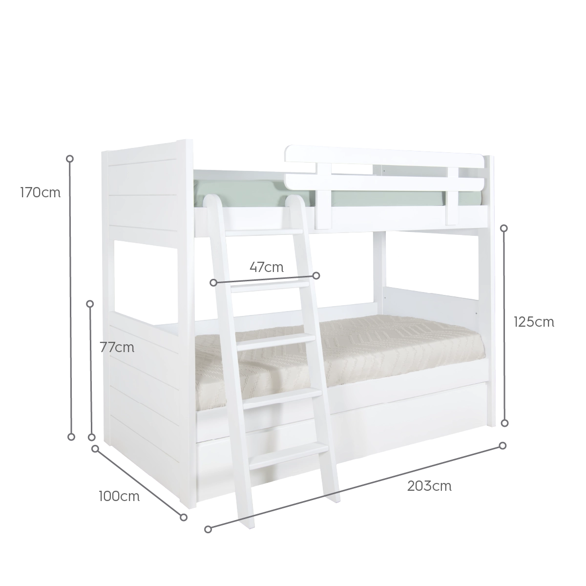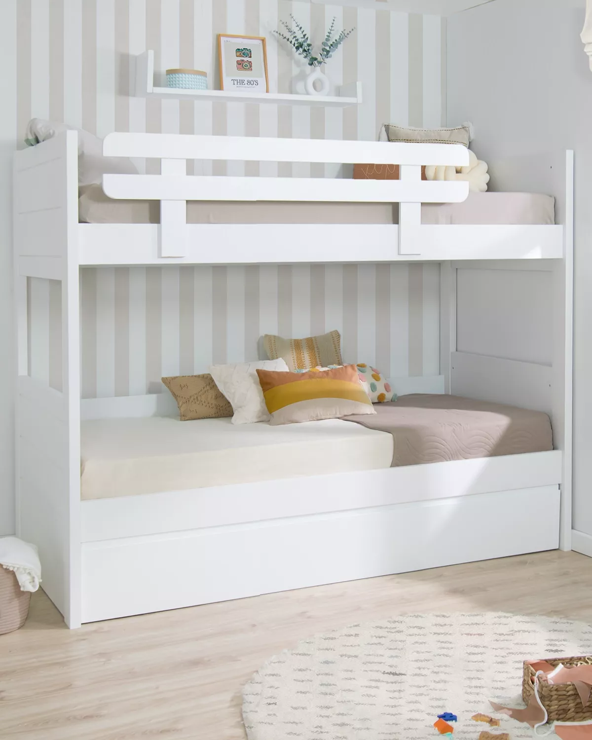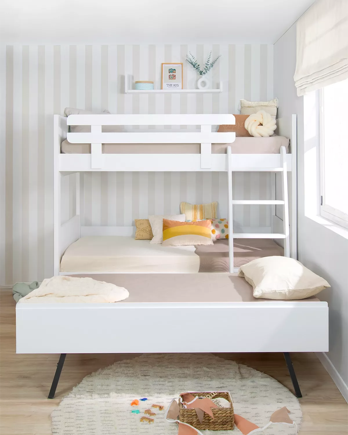 Letto a castello per bambini Triplo Lineare ideale per letti di bambini laccato in bianco e di qualità superiore. Il letto a castello è una opzione eccezionale per i fratellini o sorelline che hanno bisgono di condividere spazio, questo lettino oltre ad essere funzionale, con tre letti, uno con funzione estraibile, facile da spostarlo e scorre facilmente con i suoi piedi pieghevoli- darà un tocco speciale e elegante alla cameretta. Grazie alla sua struttura leggera però anche forte e robusta i vostri figli potranno utilizzarlo a lungo di tanti anni, dai suoi 3 anni finchè siano adulti. Fabbricato in MDF, materiale forte, rigido e di lunga durata, ideale per creare i mobili della cameretta dei bambini.