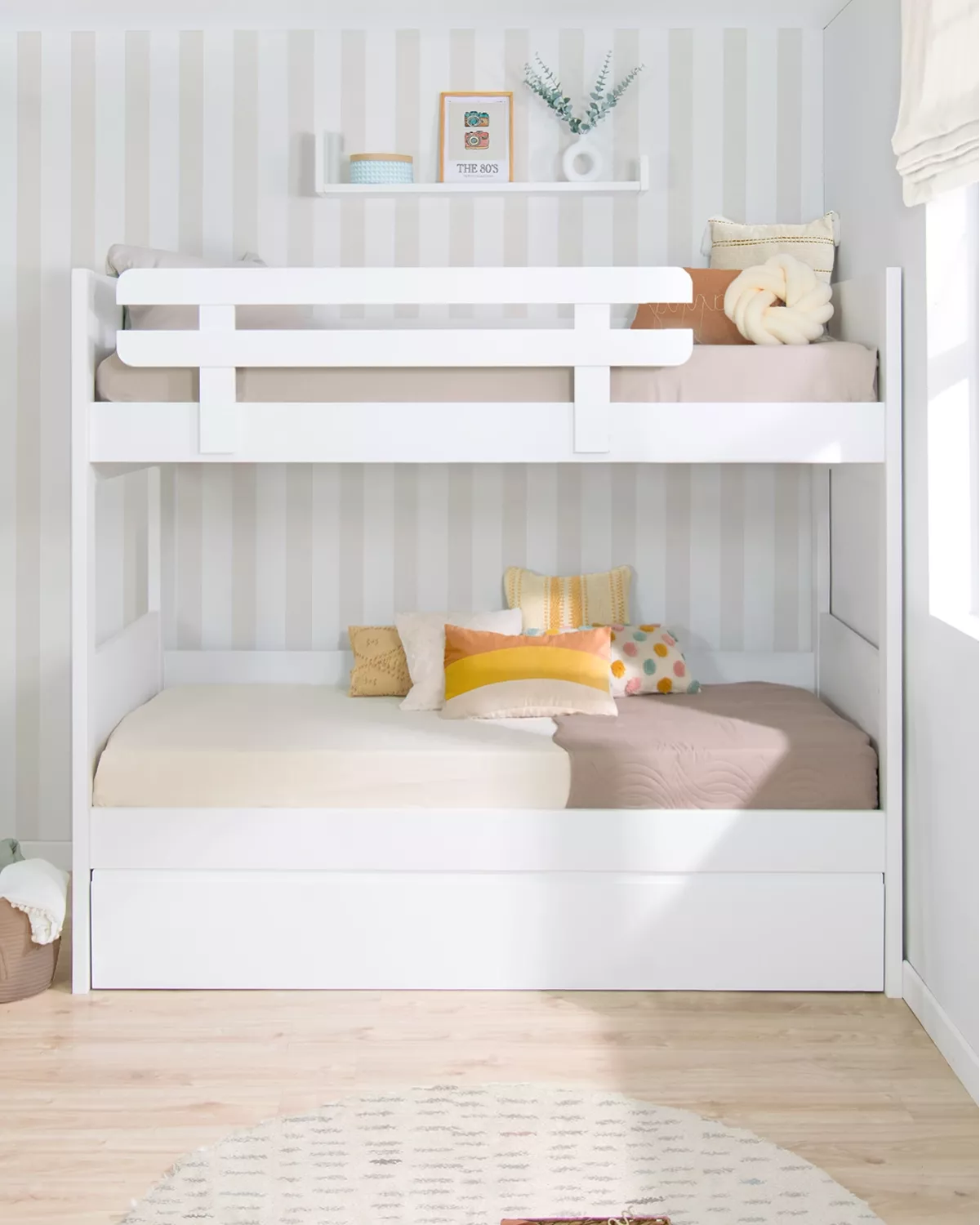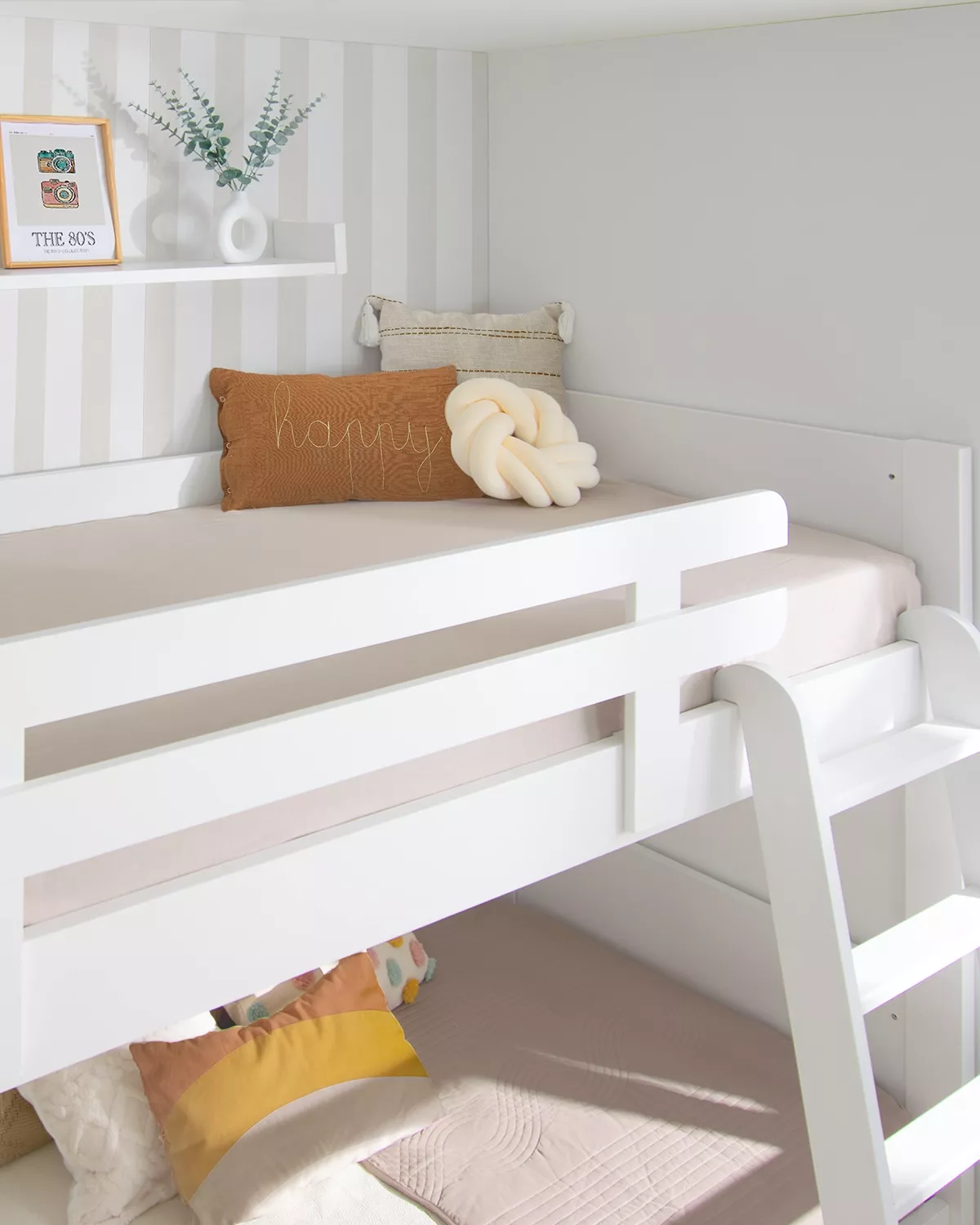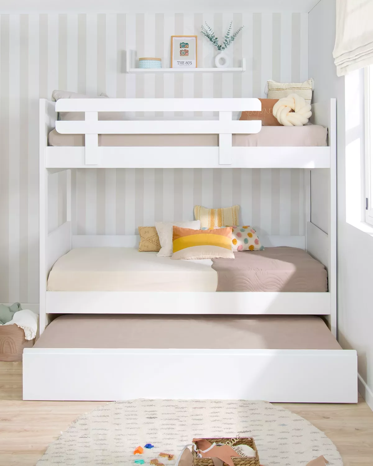 Letto a castello per bambini Triplo Lineare ideale per letti di bambini laccato in bianco e di qualità superiore. Il letto a castello è una opzione eccezionale per i fratellini o sorelline che hanno bisgono di condividere spazio, questo lettino oltre ad essere funzionale, con tre letti, uno con funzione estraibile, facile da spostarlo e scorre facilmente con i suoi piedi pieghevoli- darà un tocco speciale e elegante alla cameretta. Grazie alla sua struttura leggera però anche forte e robusta i vostri figli potranno utilizzarlo a lungo di tanti anni, dai suoi 3 anni finchè siano adulti. Fabbricato in MDF, materiale forte, rigido e di lunga durata, ideale per creare i mobili della cameretta dei bambini.