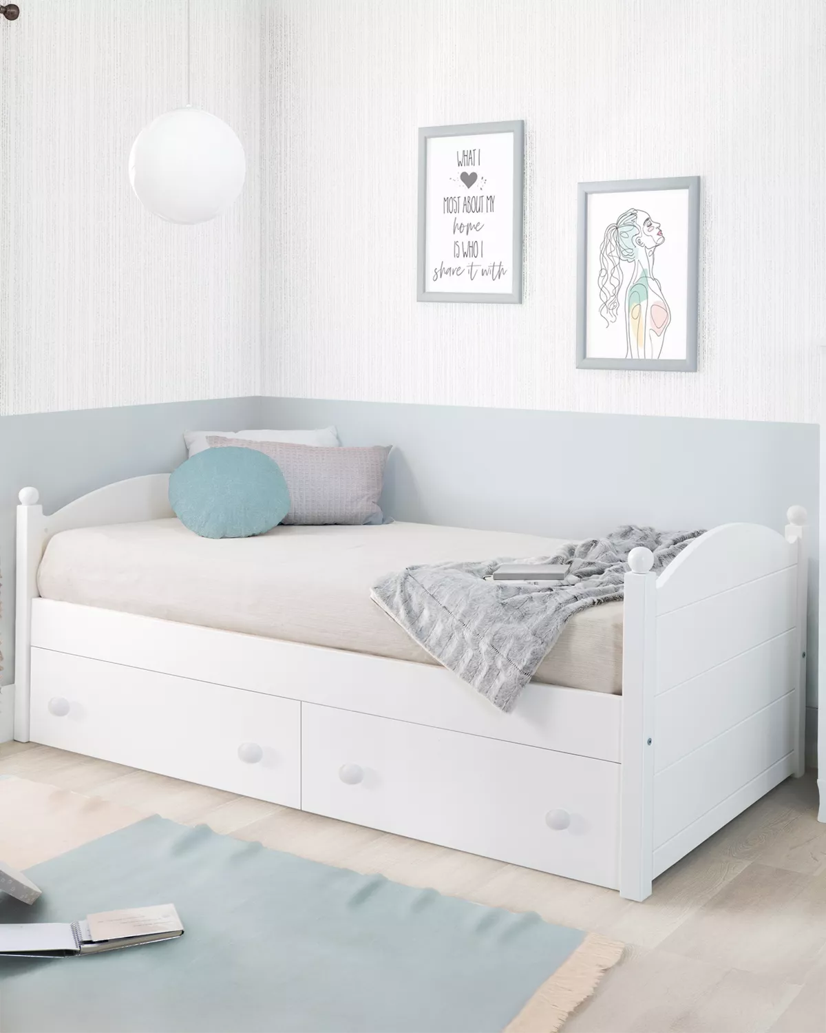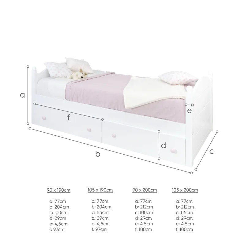 Letto con cassetti Sfera II: Un letto belissimo e molto dolce, perfetto per le camere da letto delle bambine, con un disegno moderno, avvolgente e linee armoniose, un letto perfetto per riempiere la camera di tenerezza.  Fabbricato in legno di pino e MDF, materiale di gran qualità, resistenza e durabilità, essendo sicuramente una delle migliori opzioni per quelli che vogliano un mobile per tanti anni. I cassetti che ci sono sotto servono per massimizzare lo spazio, e fare più facile riassettare tutta la camera. Ideale per camere con spazi ridotti o che hanno bisogno di tenerci dentro tante cose.
