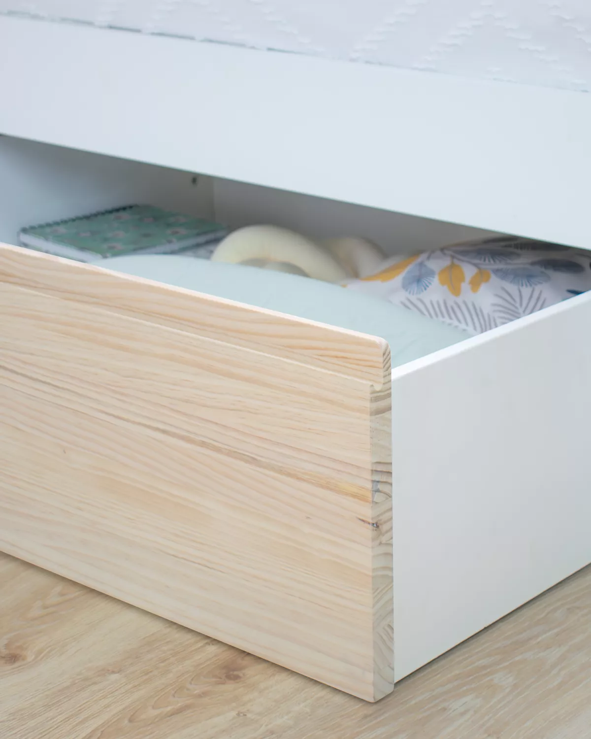 Il nostro letto per ragazzi bianco è un letto perfetto per le camere da letto con spazio limitato. Laccato in bianco e legno naturale