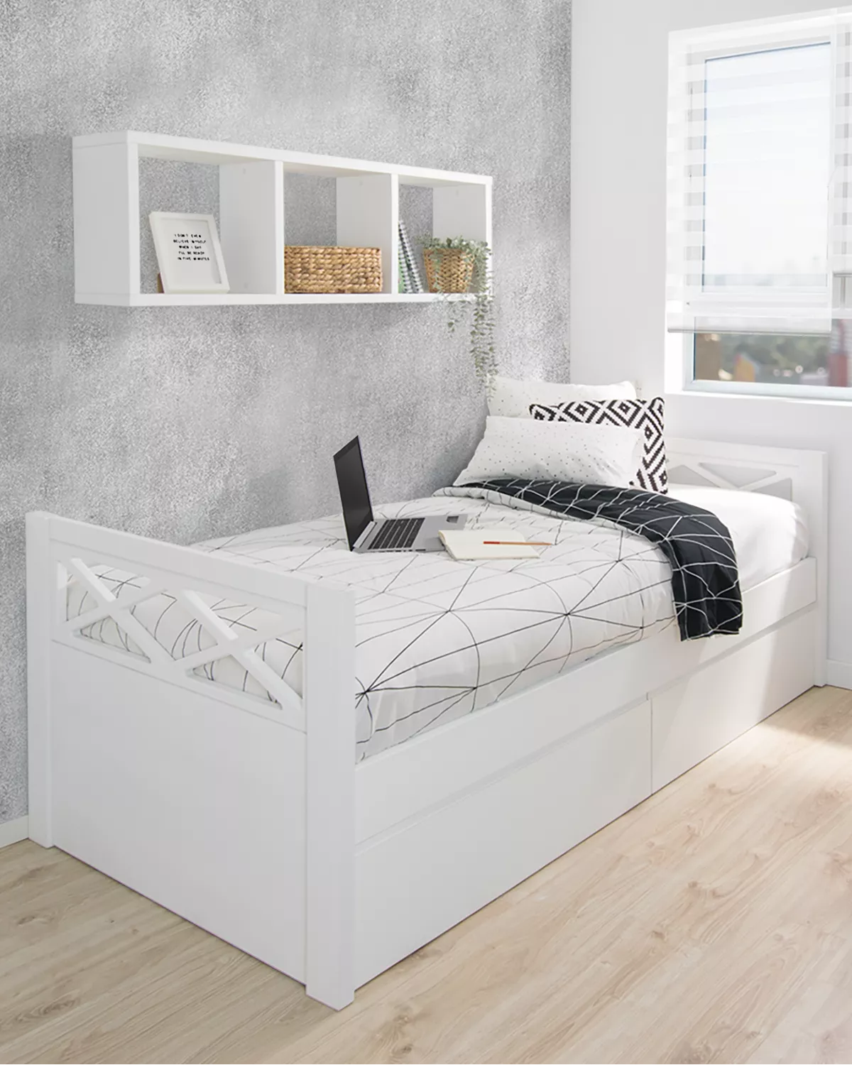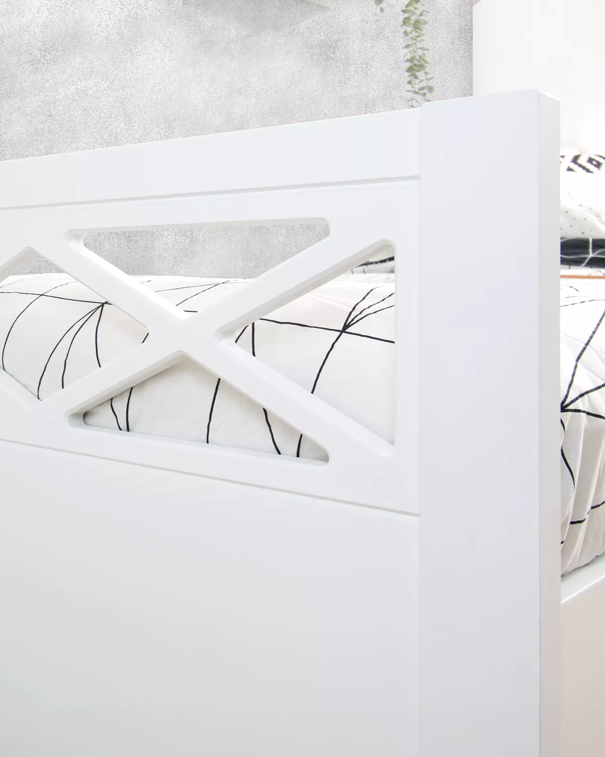 Il nostro letto Croce è un letto con cassetti perfetto per le camere da letto con spazio limitato. Un mobile di alta qualità laccato bianco.