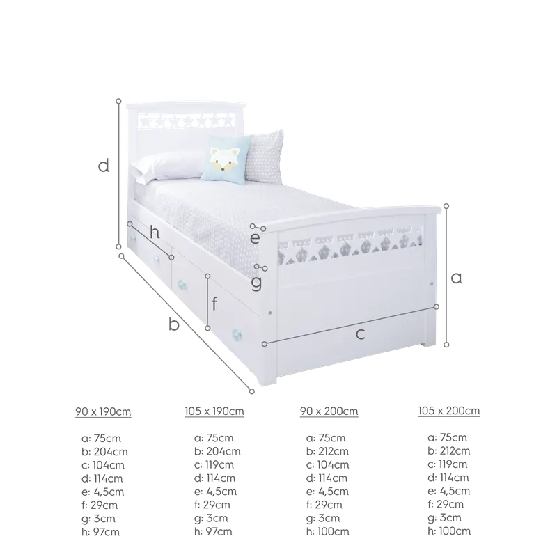 Letto con cassetti Stelle II è un letto carinissimo perchè sia la testiera come la pediera hanno la decorazione di stelline, un bel elemento per comporre una camera bella e originale. Fabbricato legno di pino e MDF, materiale di gran qualità, resistenza e durabilità, essendo sicuramente una delle migliori opzioni per quelli che vogliano un mobile per tanti anni. I cassetti che ci sono sotto servono per massimizzare lo spazio, e fare più facile riassettare tutta la camera. Ideale per camere con spazi ridotti o che hanno bisogno di tenerci dentro tante cose.