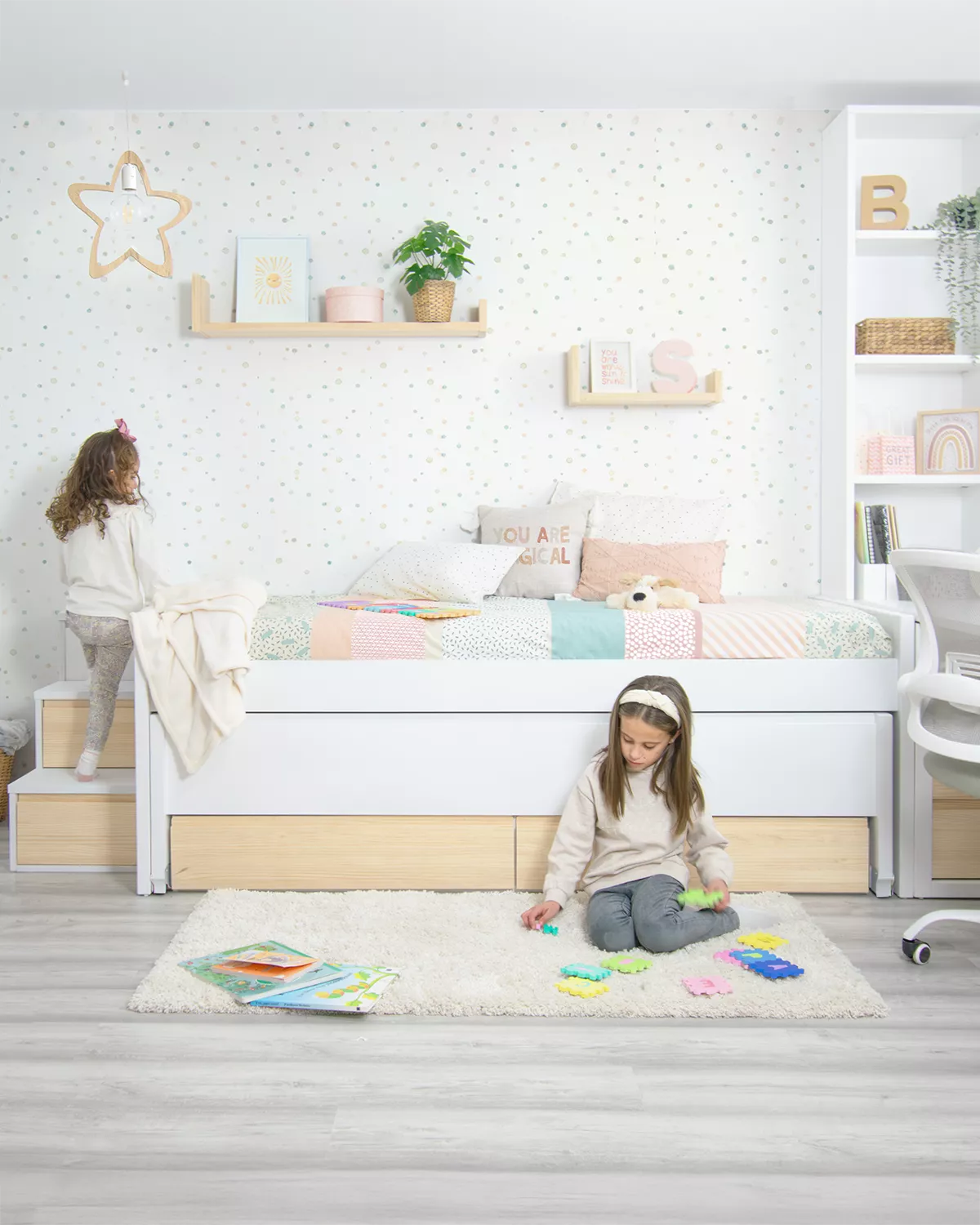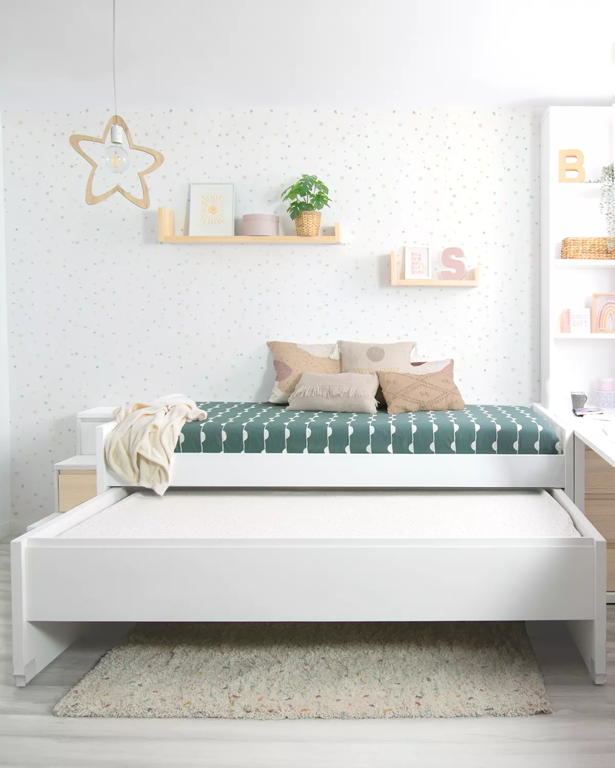 PERCHÉ SCEGLIERE UN LETTO CON CASSETTI BAINBA?Stile e comfort per la crescita: La struttura leggera ma robusta del nostro letto a scomparsa è pensata per accompagnare i vostri figli dall'infanzia all'età adulta. Con una base laccata bianca, questo letto a scomparsa si distingue per il calore e la semplicità del suo design.