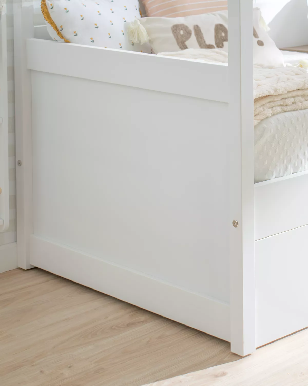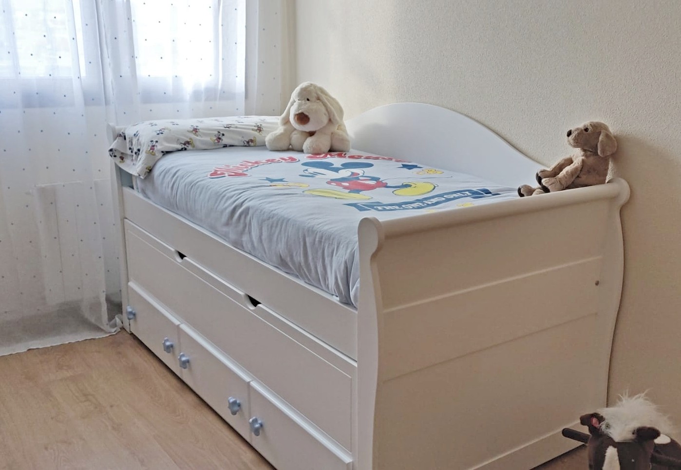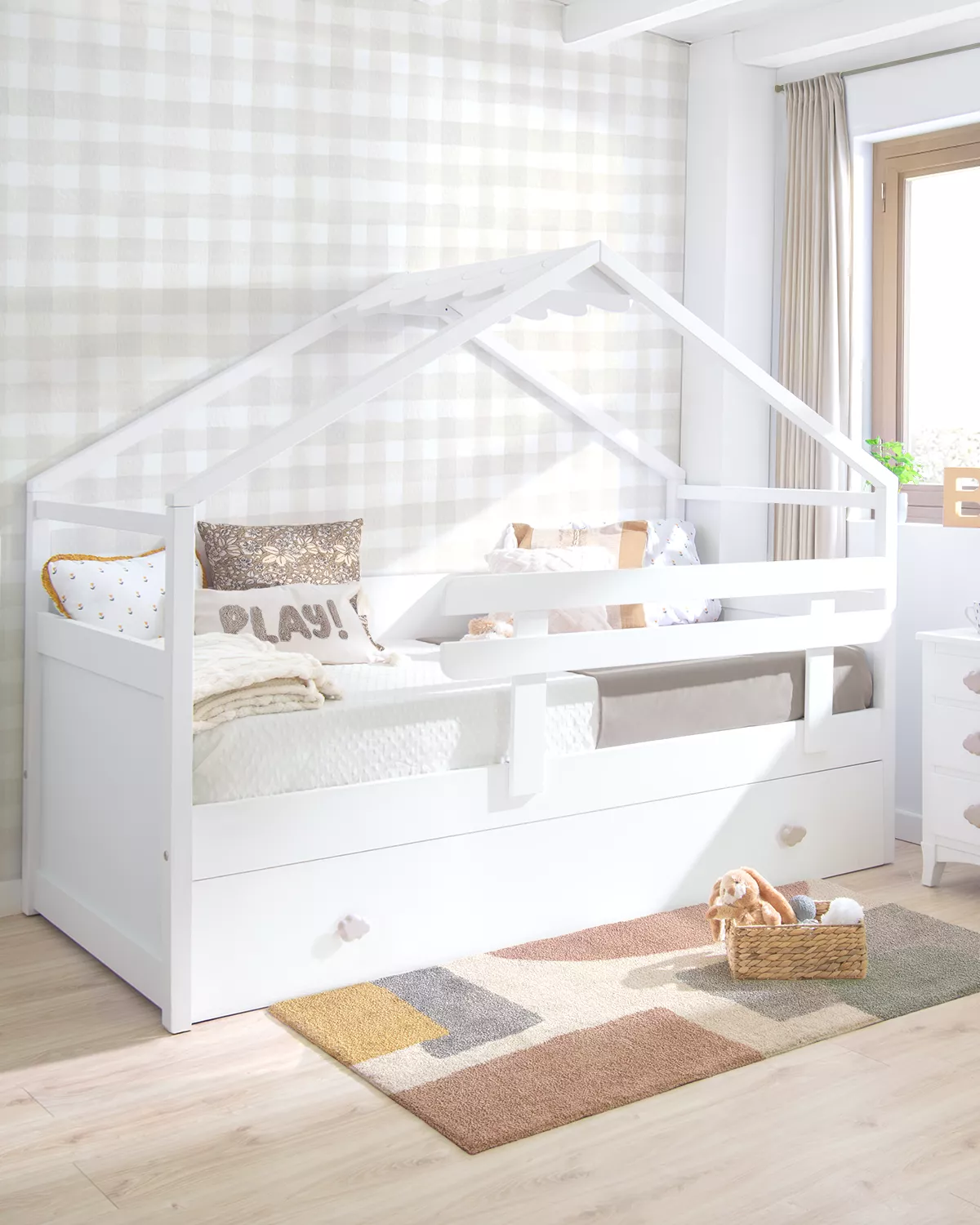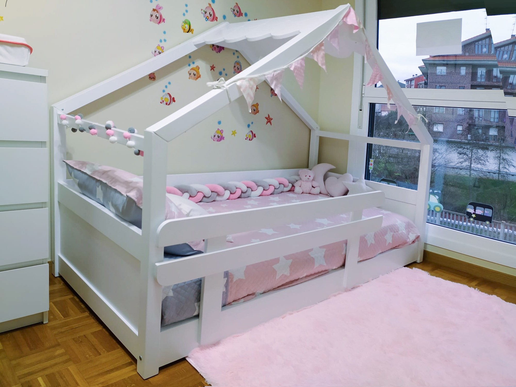 Letto estraibile Casetta bianca Tetto è uno dei nostri gioelli, un letto bellissimo con un disegno originale e divertente. Fabbricato in legno di pino e MDF, materiale di gran qualità, resistenza e durabilità, essendo sicuramente una delle migliori opizioni per quelli che vogliano un mobile per tanti anni. Inoltre alla bellezza e la decorazione originale e divertita questo letto è anche molto funzionale perchè il letto estraibile è molto facile da utilizzare scorrendo soavemente sulla terra; i suoi piedi pieghevoli cadono gentilmente appena si solleva un pò il peso del letto in modo che non è necessario nessun movimento forzoso o difficile.