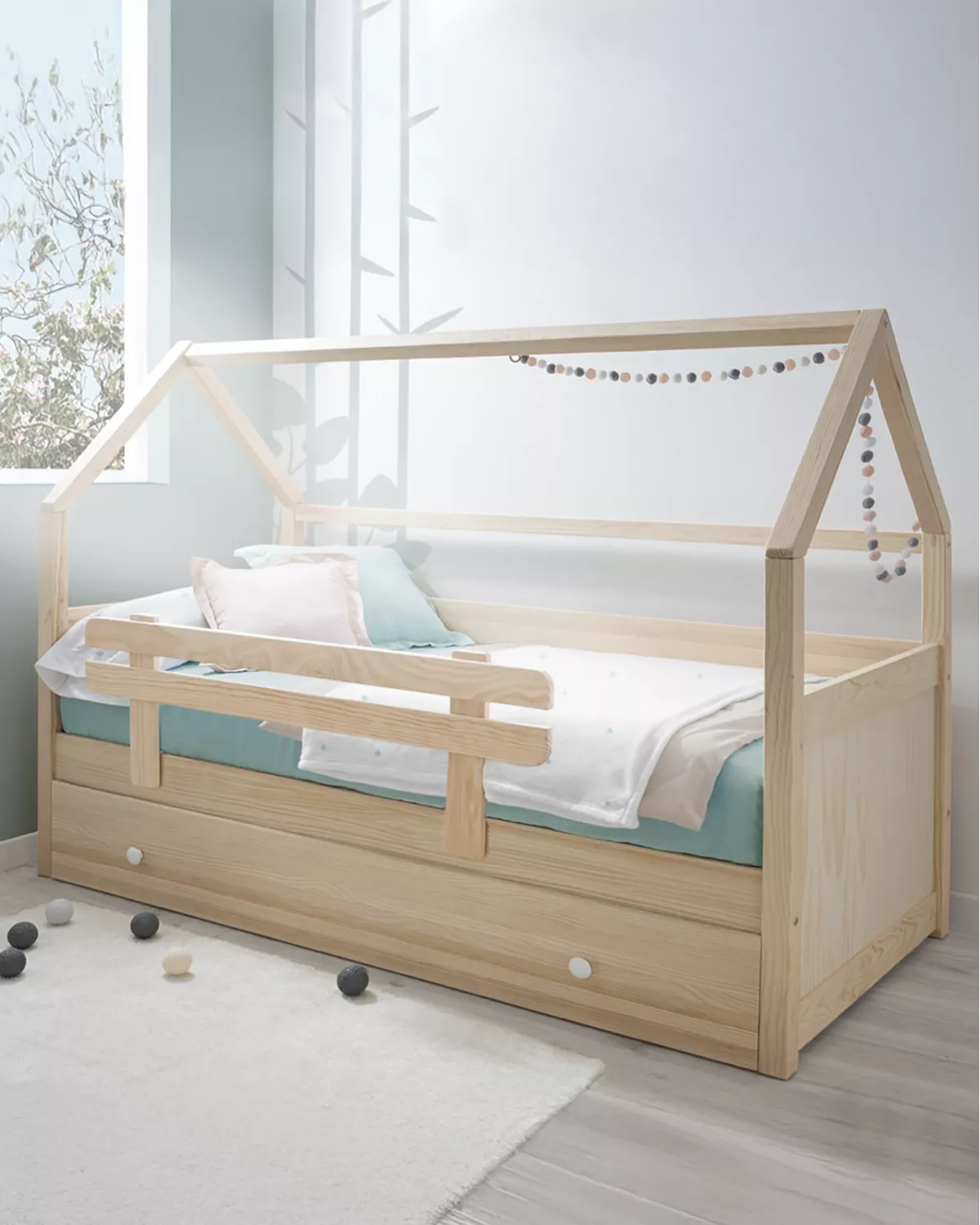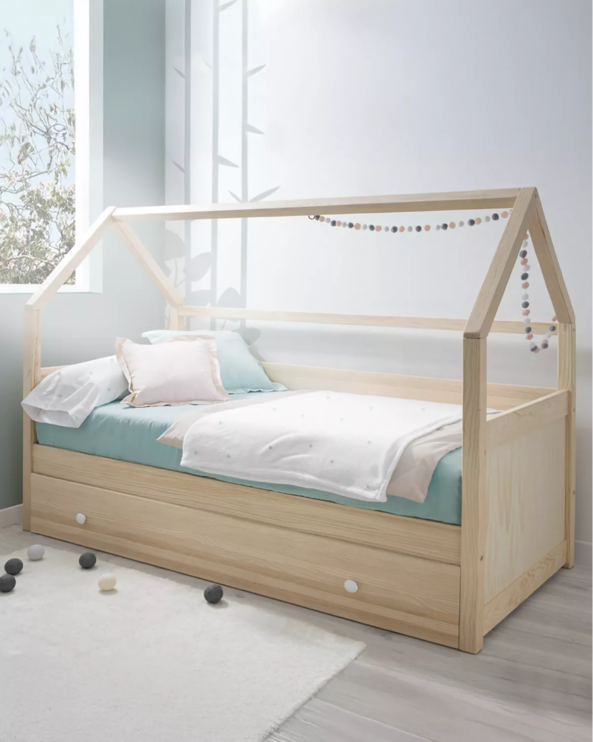 Letto estraibile Casetta in legno naturale è uno dei nostri gioelli, un letto bellissimo con un disegno originale e divertente. Fabbricato in legno di pino, materiale di gran qualità, resistenza e durabilità, essendo sicuramente una delle migliori opizioni per quelli che vogliano un mobile per tanti anni. Inoltre alla bellezza e la decorazione originale e divertita questo letto è anche molto funzionale perchè il letto estraibile è molto facile da utilizzare scorrendo soavente sulla terra; i suoi piedi pieghevoli cadono gentilmente appena si solleva un pò il peso del letto in modo che non è necessario nessun movimento forzoso o difficile.
