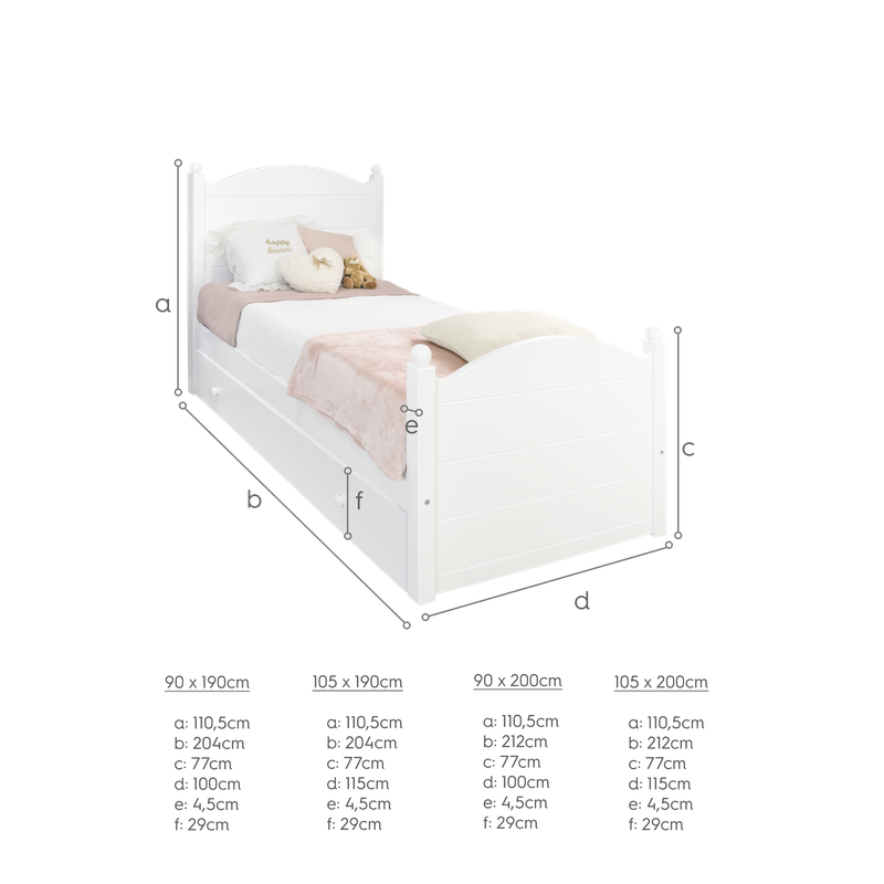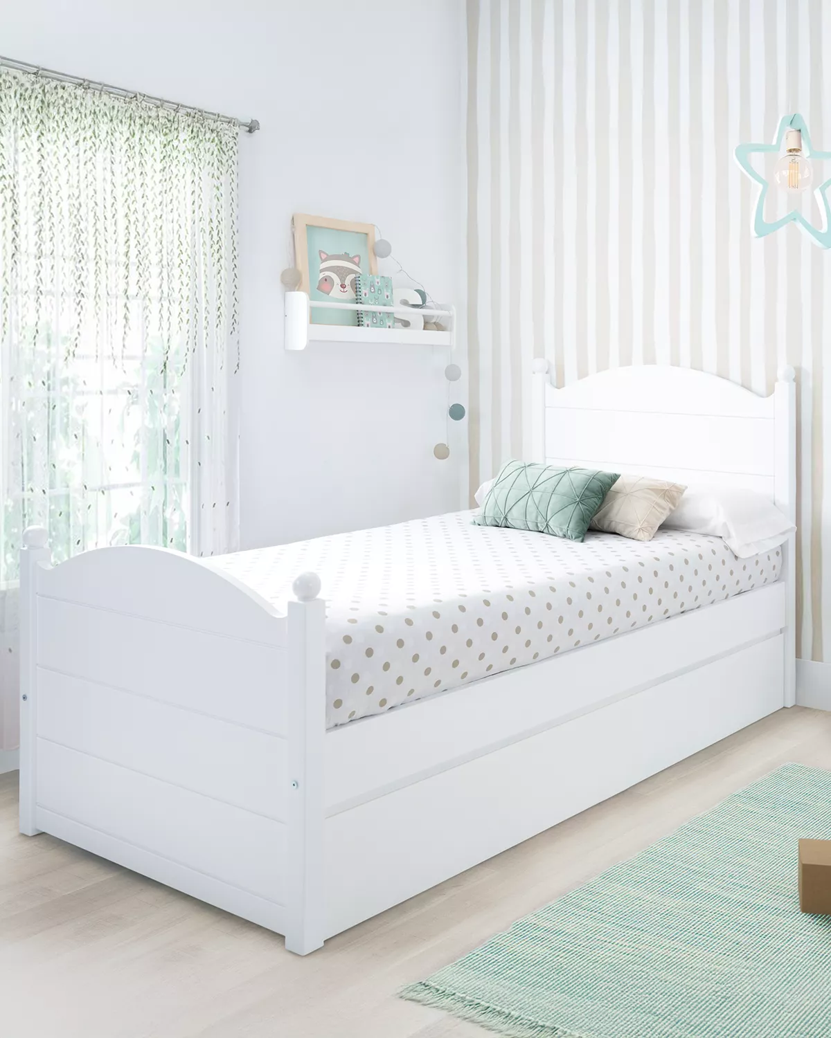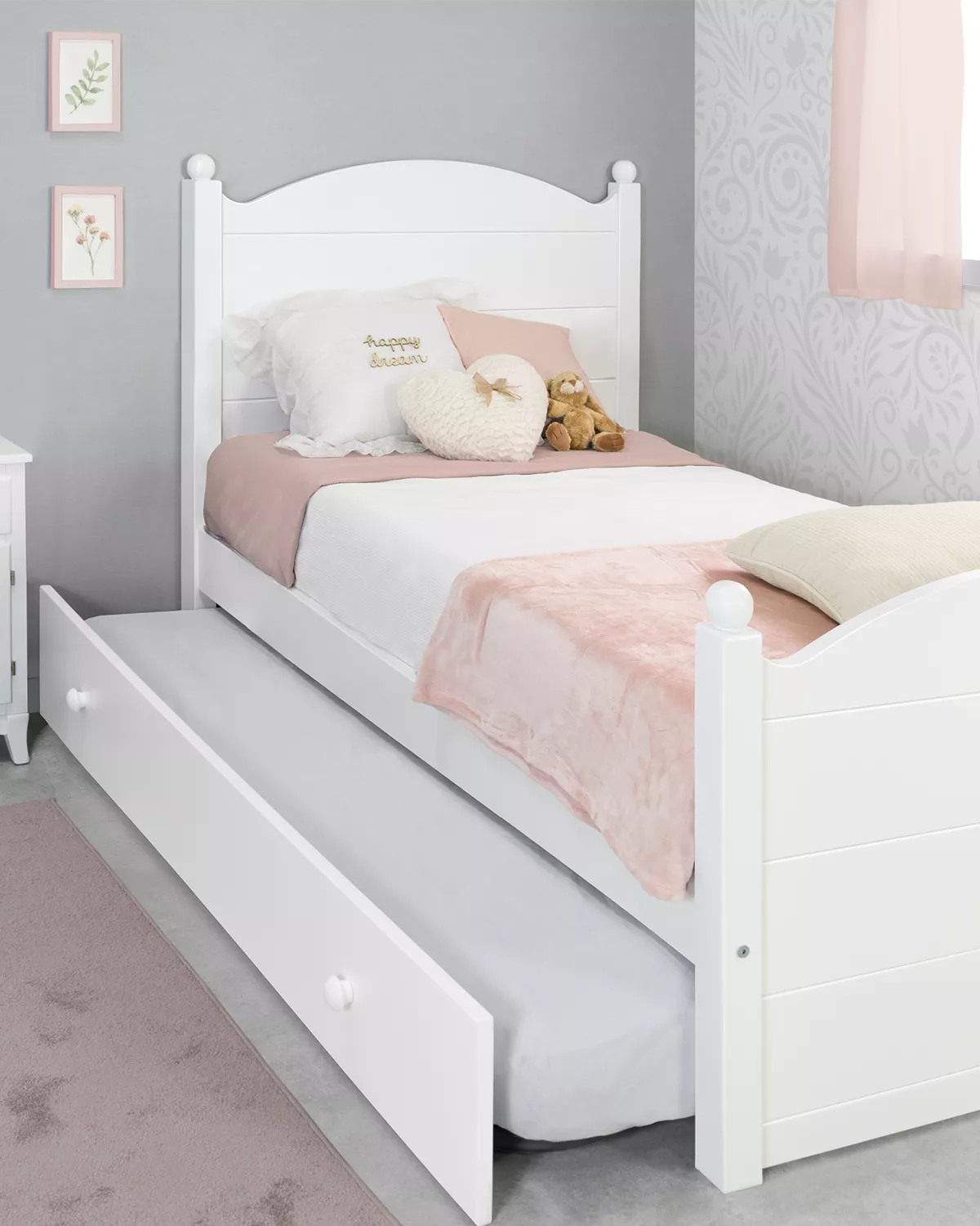 Letto estraibile Sfera: Un letto belissimo e molto dolce, perfetto per le camere da letto delle bambine, con un disegno moderno, avvolgente e linee armoniose, un letto perfetto per riempiere la camera di tenerezza. Fabbricato in legno di pino e MDF, materiale di gran qualità, resistenza e durabilità, essendo sicuramente una delle migliori opzioni per quelli che vogliano un mobile per tanti anni. Inoltre alla bellezza e la decorazione romantica e delicata questo letto è anche molto funzionale perchè il letto estraibile è molto facile da utilizzare scorrendo soavente sulla terra; i suoi piedi pieghevoli cadono gentilmente appena si solleva un pò il peso del letto in modo che non è necessario nessun movimento forzoso o difficile.