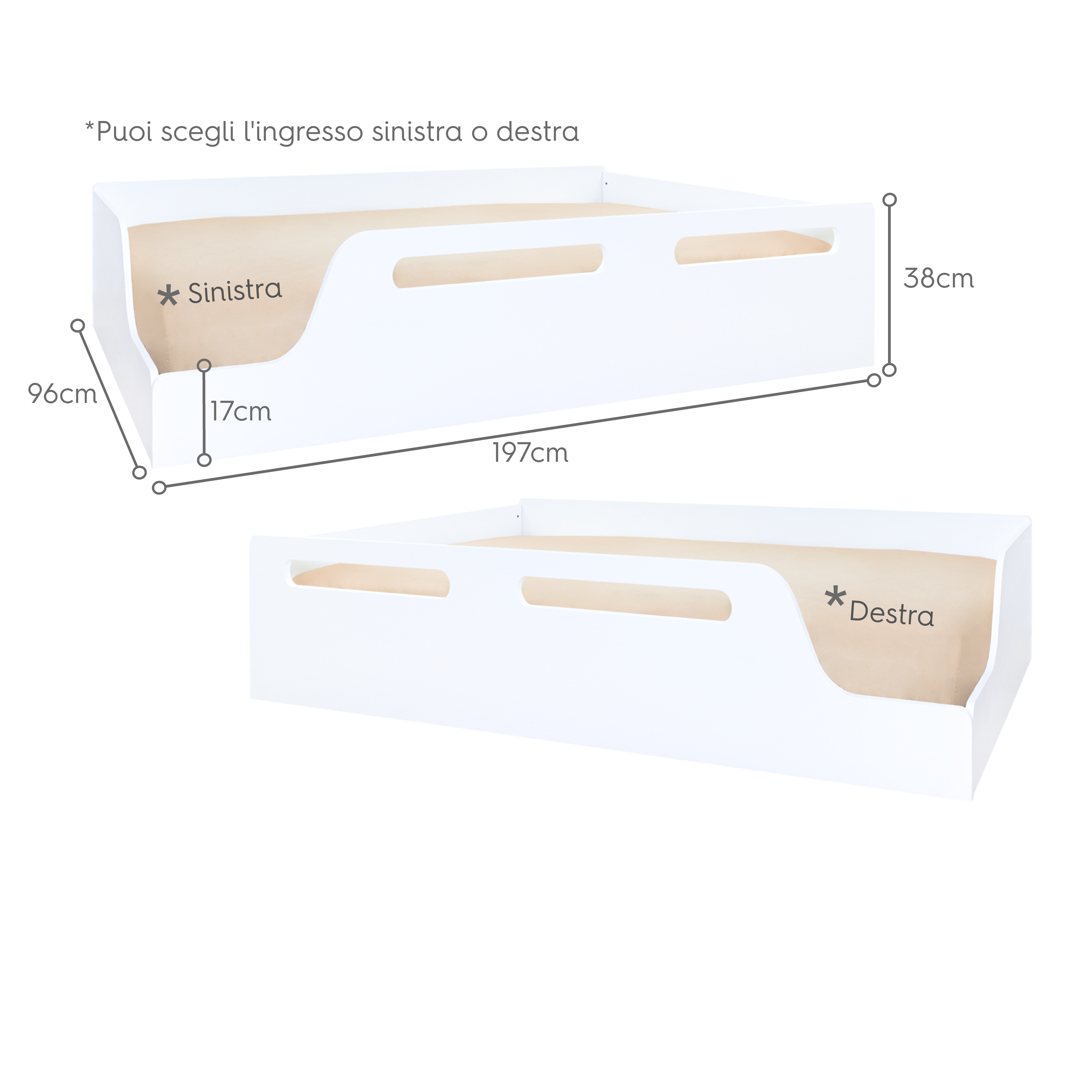 Misure letto: 197 cm lughezza x 95 cm larguezza x 38 cm altezza.