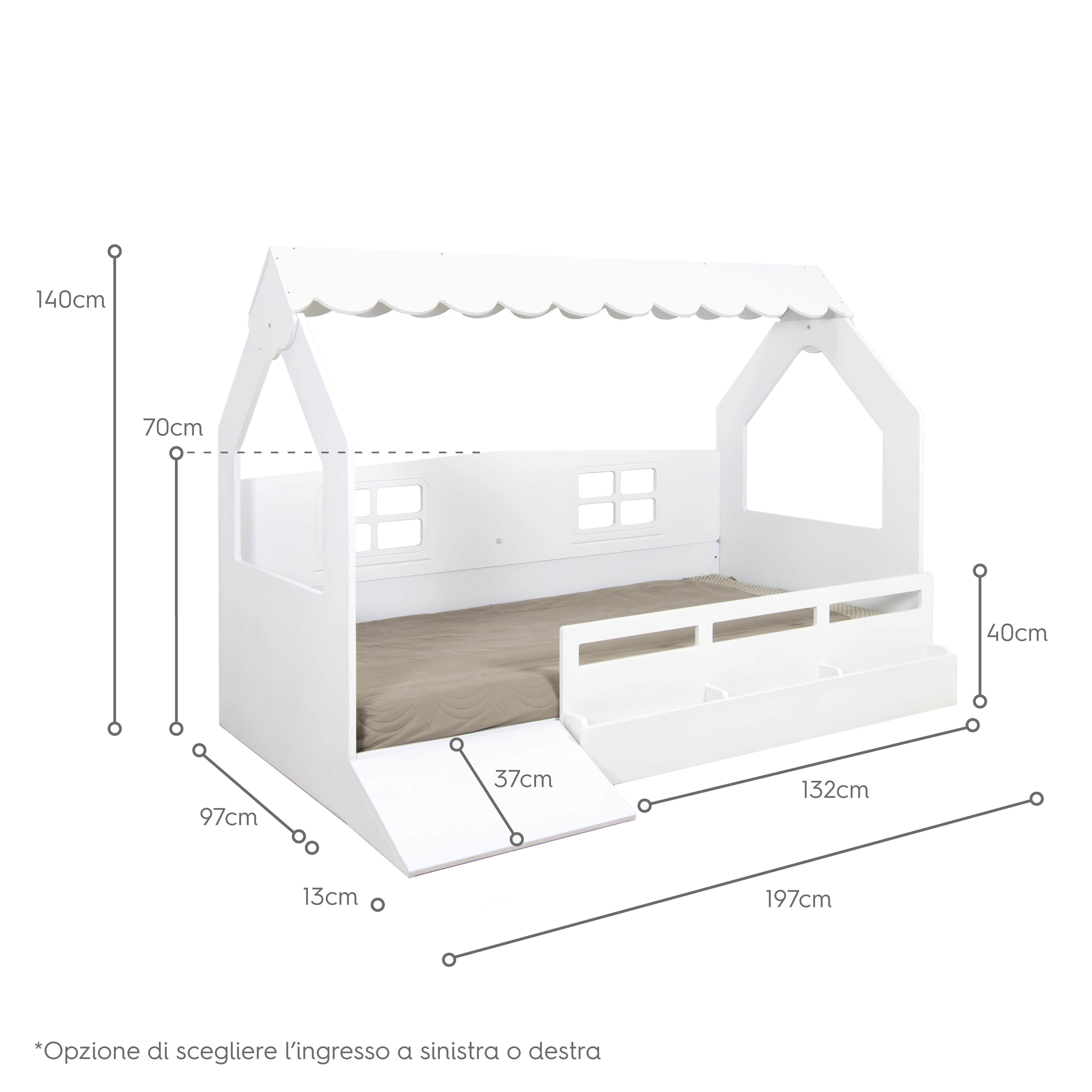 Misure letto: 197 cm lunghezza x 110 cm larguezza x 140 cm altezza.