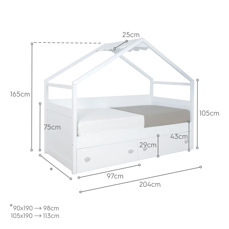 Con un disegno a forma di casetta e un piccolo soffitto come decorazione superiore, questo letto creerà un ambiente perfetto nella camera dei vostri bimbi. Grazie alla sua struttura leggera e anche forte i tuoi figli potranno utilizzarlo  a lungo di tanti anni, dai suoi 3 anni finchè siano adulti.  Inoltre, i due cassetti inferiori, che creano uno spazio in più per lo stoccaggio, hanno delle finiture in bianco che permettono abbinarli facilmente con qualsiasi spazio e stile di decorazione. Il mobile è durevole, ha un disegno bello e elegante che fa di tutti gli spazi, il migliore.