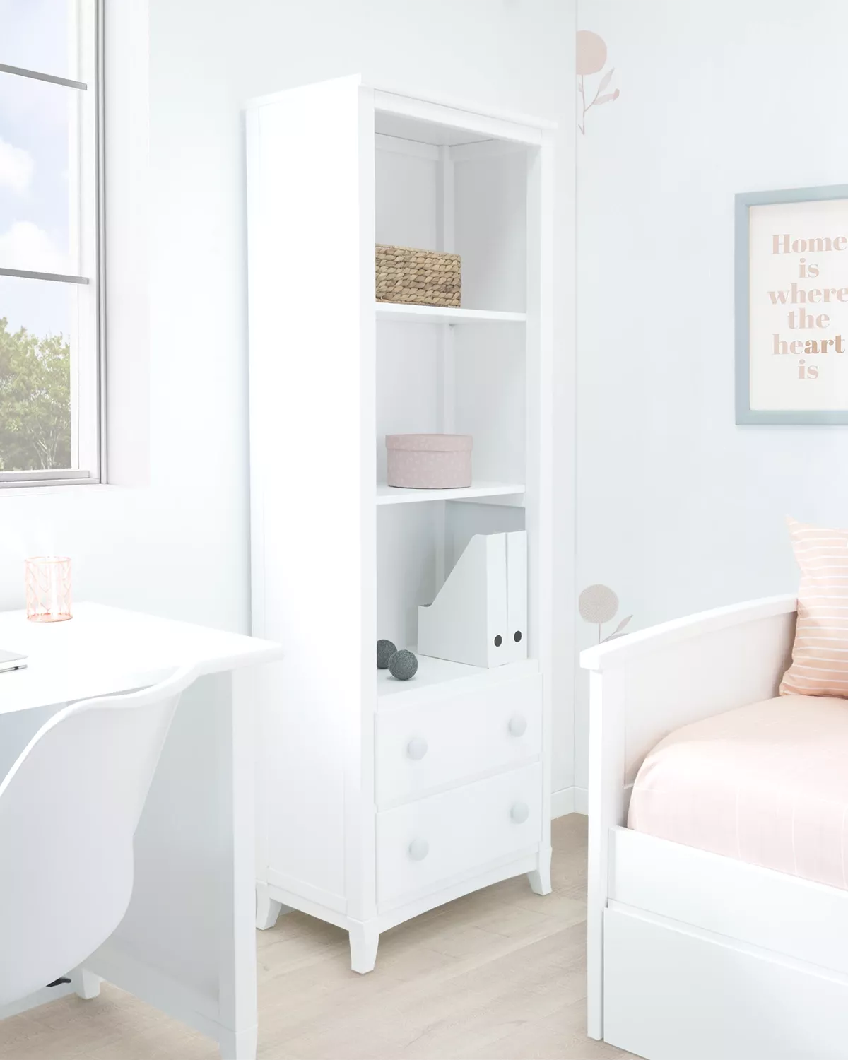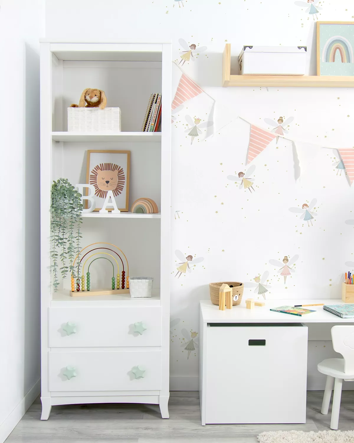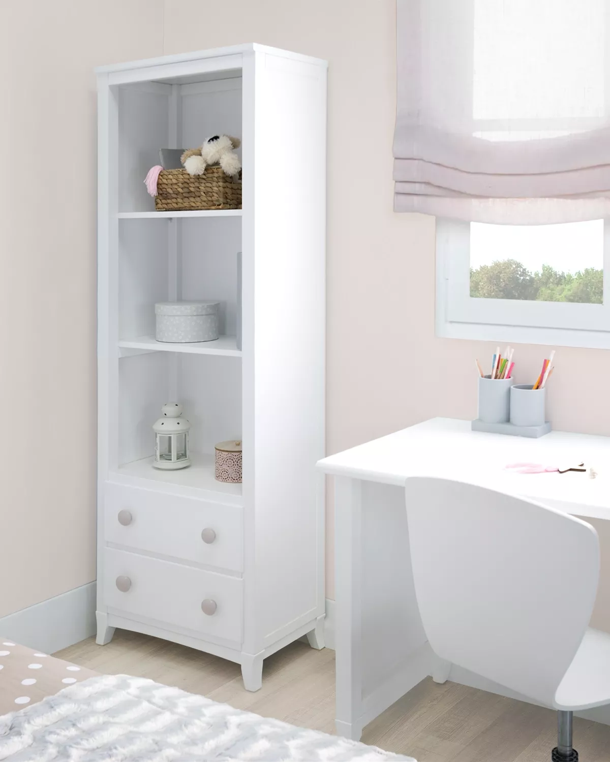 Libreria con cassetti: bella libreria molto utile e spaziosa, oltre alle mensole ci sono dei cassettoni sotto per offrire ancora più spazio. Un disegno semplice, moderno e molto elegante, ideale per complementare la camera da letto dei bambini con molto stile. Un colore bianco anche facile da abbinare con qualsiasi ambiente e stile decorativo. Fabbricata in legno di pino e MDF, materiale forte, rigido e di lunga durata. Un mobile da godere per tanti anni!