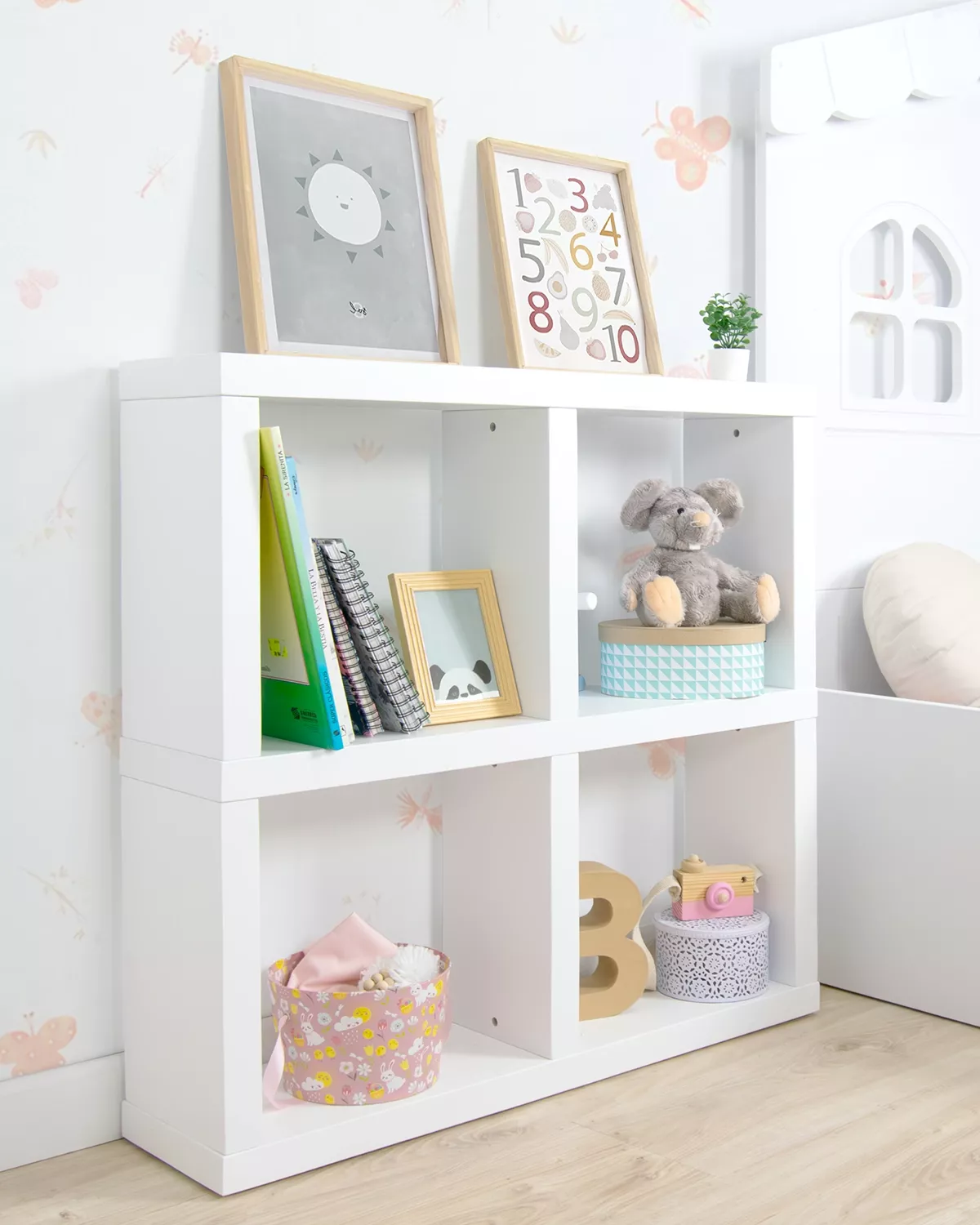 Questa libreria quadrata con 4 scomparti ti aiuterà ad arredare qualsiasi stanza, che si tratti della cameretta del tuo piccolo in stile Montessori, della cameretta di un bambino o persino di un adolescente.