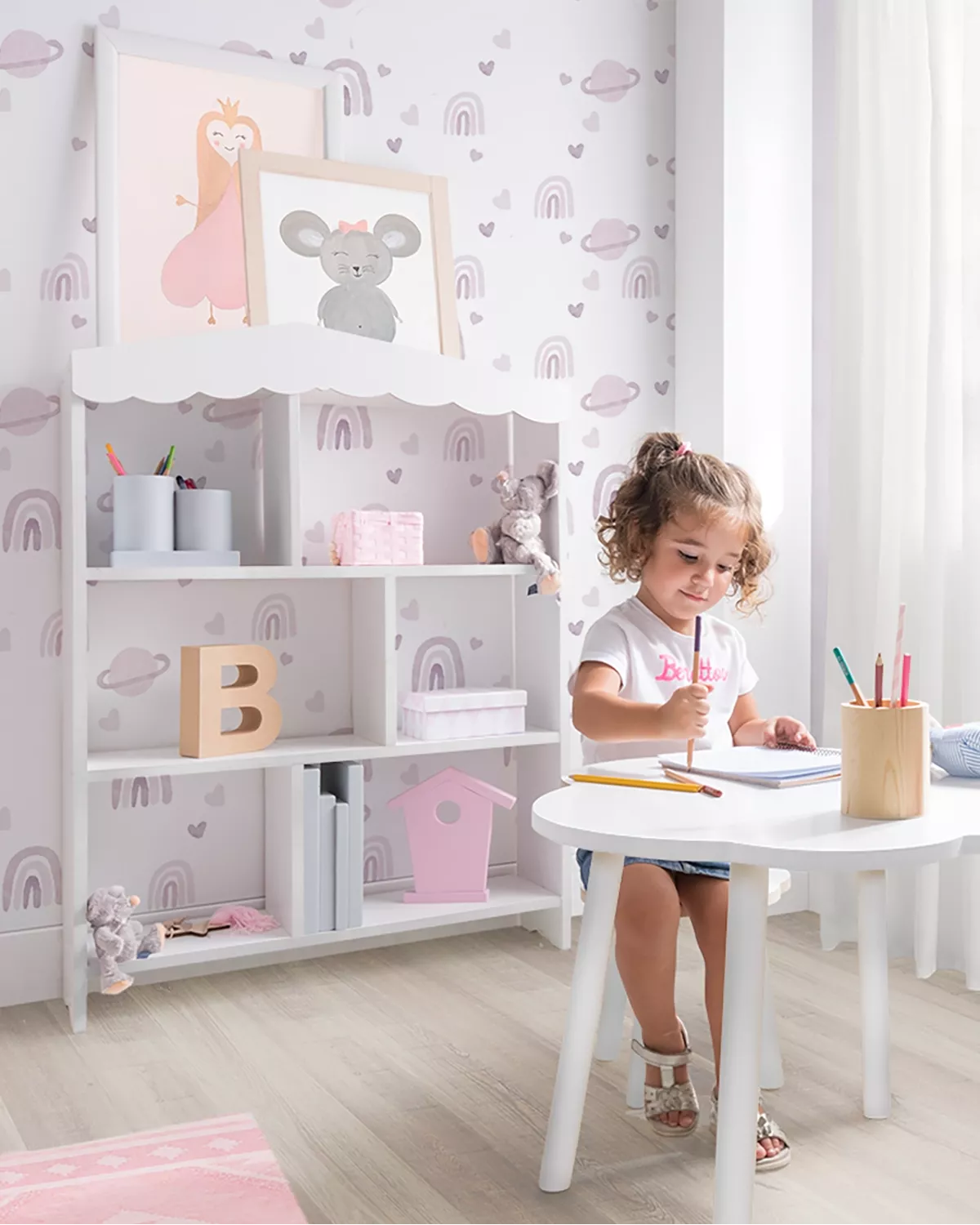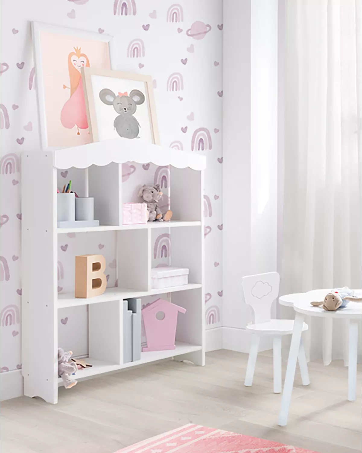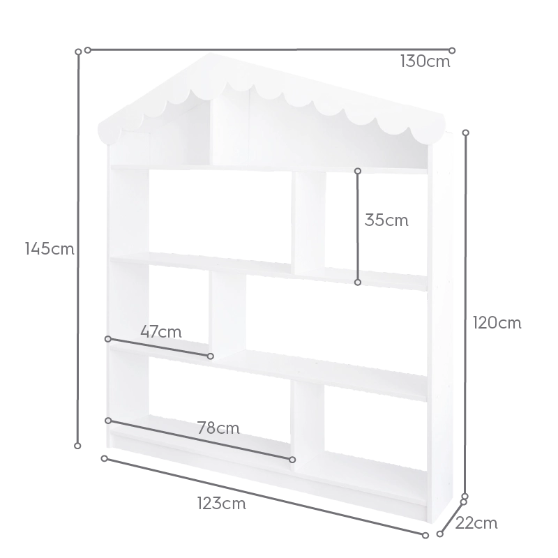 Questa originale libreria a forma di divertente casetta con una bella finitura laccata bianca e naturale farà la gioia dei più piccoli. Offre un ampio spazio per riporre tutti i libri e gli oggetti preferiti. Un mobile originale e accessibile che permette di creare un mondo pieno di avventure e fantasia con i suoi numerosi scomparti. Dettaglio della parte superiore del tetto.