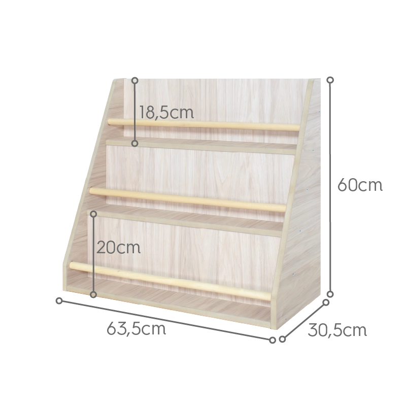 Questa libreria si adatta alla decorazione di qualsiasi bambino e aggiunge un tocco naturale e caldo alla stanza. I suoi 3 ripiani offrono lo spazio ideale per organizzare e tenere in ordine tutte le loro storie preferite, aiutando i bambini a selezionare e restituire i libri da soli, senza bisogno dell'aiuto di un adulto.