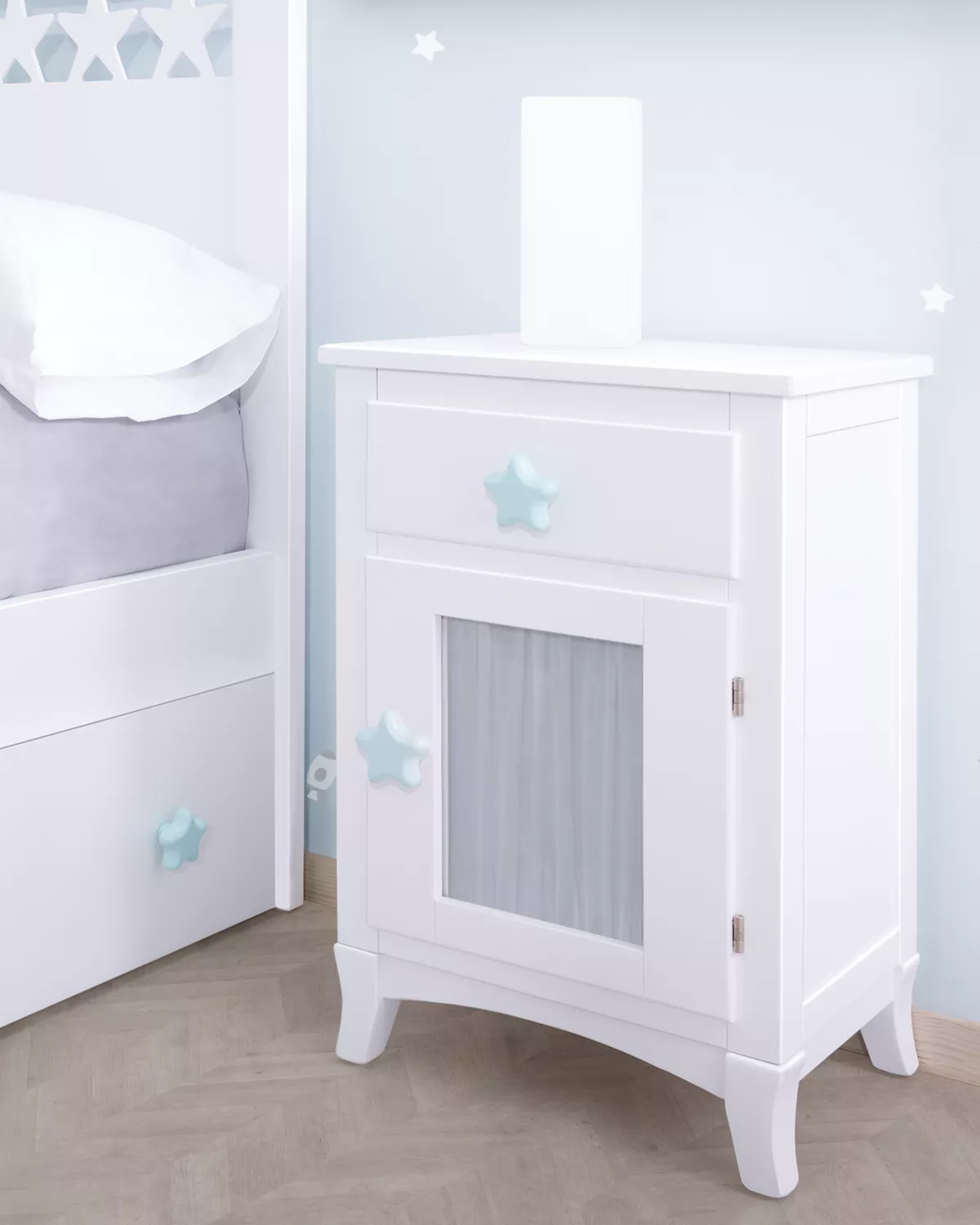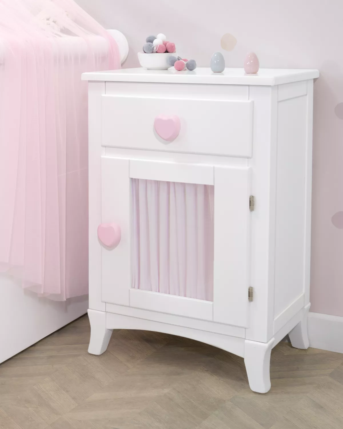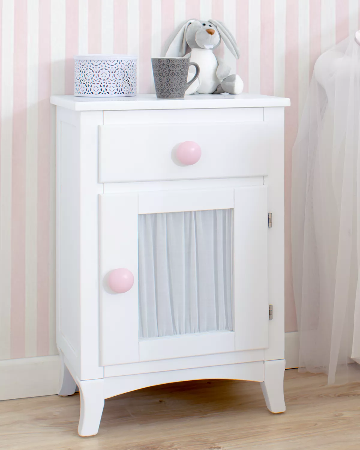 Il Comodino con anta e tende è un bel oggetto di decorazione che sarà il complemento ideale per la camera da letto dei bambini, messo vicino al letto è perfetto per metterci sopra una lampada per iluminare la staza durante la notte o quando i bimbi vanno addormentarsi, i cassetti che ci sono possono essere molto utili per guardare tutti gli oggetti che loro hanno bisgono vicini. La tenda che può essere scelta nel colore rosa anche, porta gioia e un pò di colore alla cameretta. Questo piccolo mobile è stato fabbricato in legno di pino e MDF, materiale forte, resistente e molto durevole.