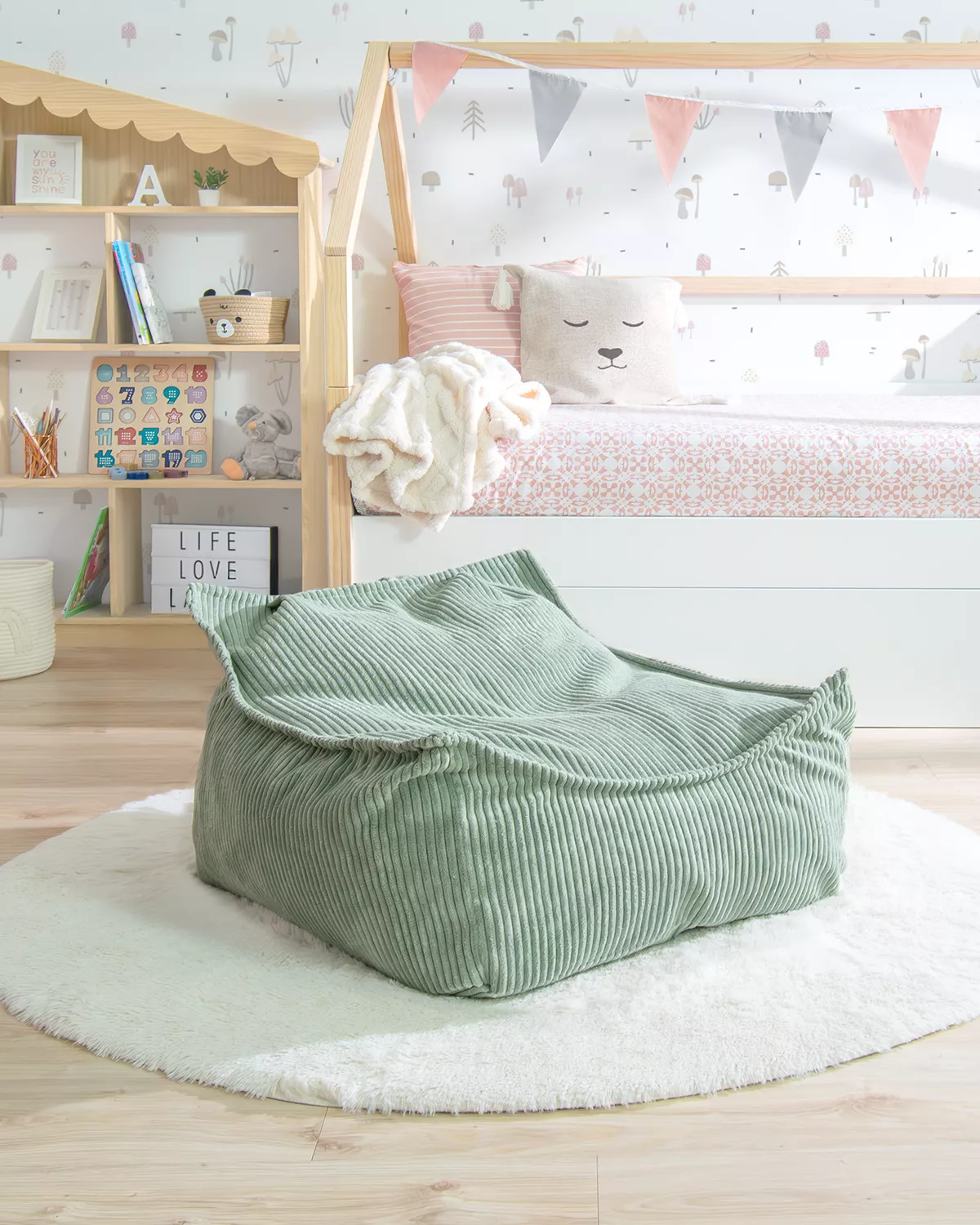Un pouf poltrona verde per bambini dal design originale e confortevole. L’elemento decorativo perfetto per rendere speciale la cameretta dei più piccoli.