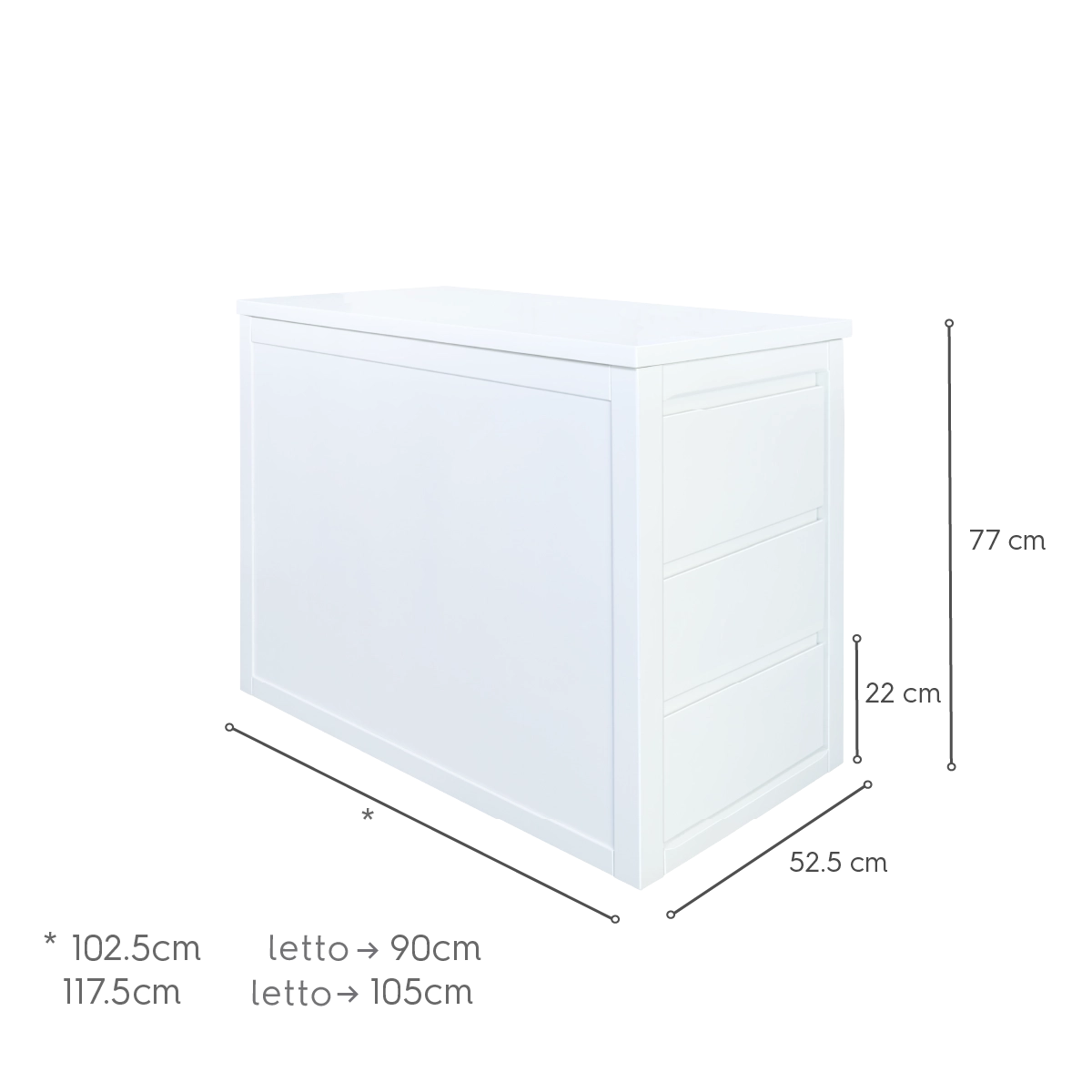 - Per letti 90cm: 52,5cm larghezza x 102,5cm profondità x 77cm altezza.