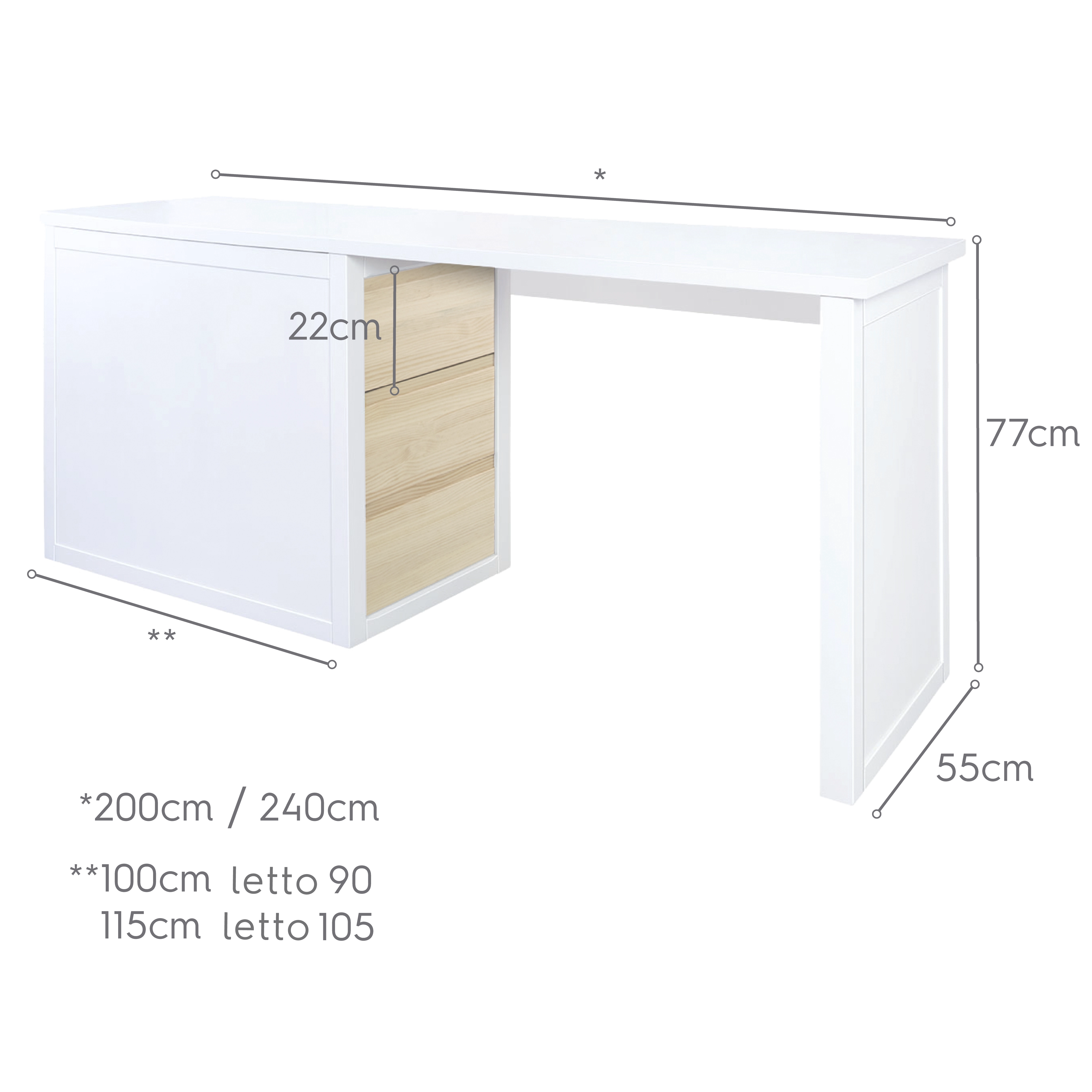 - Per letti 90cm: 100cm larghezza x 49cm profondità x 74,5cm altezza.