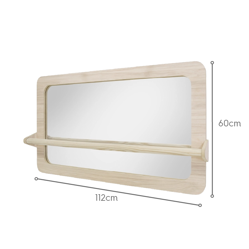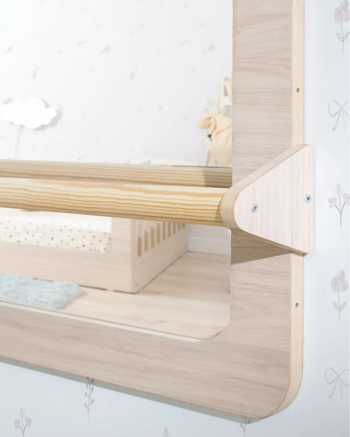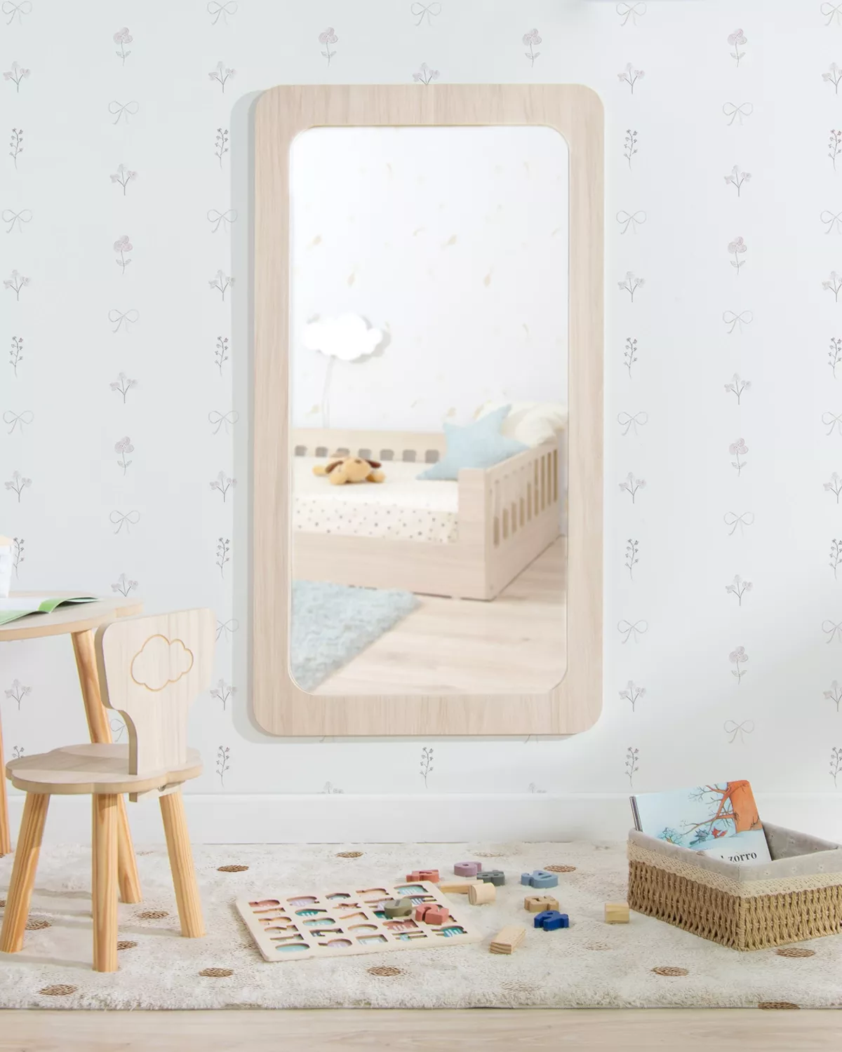 Un mobile essenziale per una cameretta in stile Montessori. I piccoli di casa potranno avere uno specchio alla loro altezza, perfetto per riconoscere i loro gesti, adattandosi al loro sviluppo e alla loro crescita. La sua forma e la sua composizione lo rendono un oggetto totalmente sicuro per i nostri bambini.