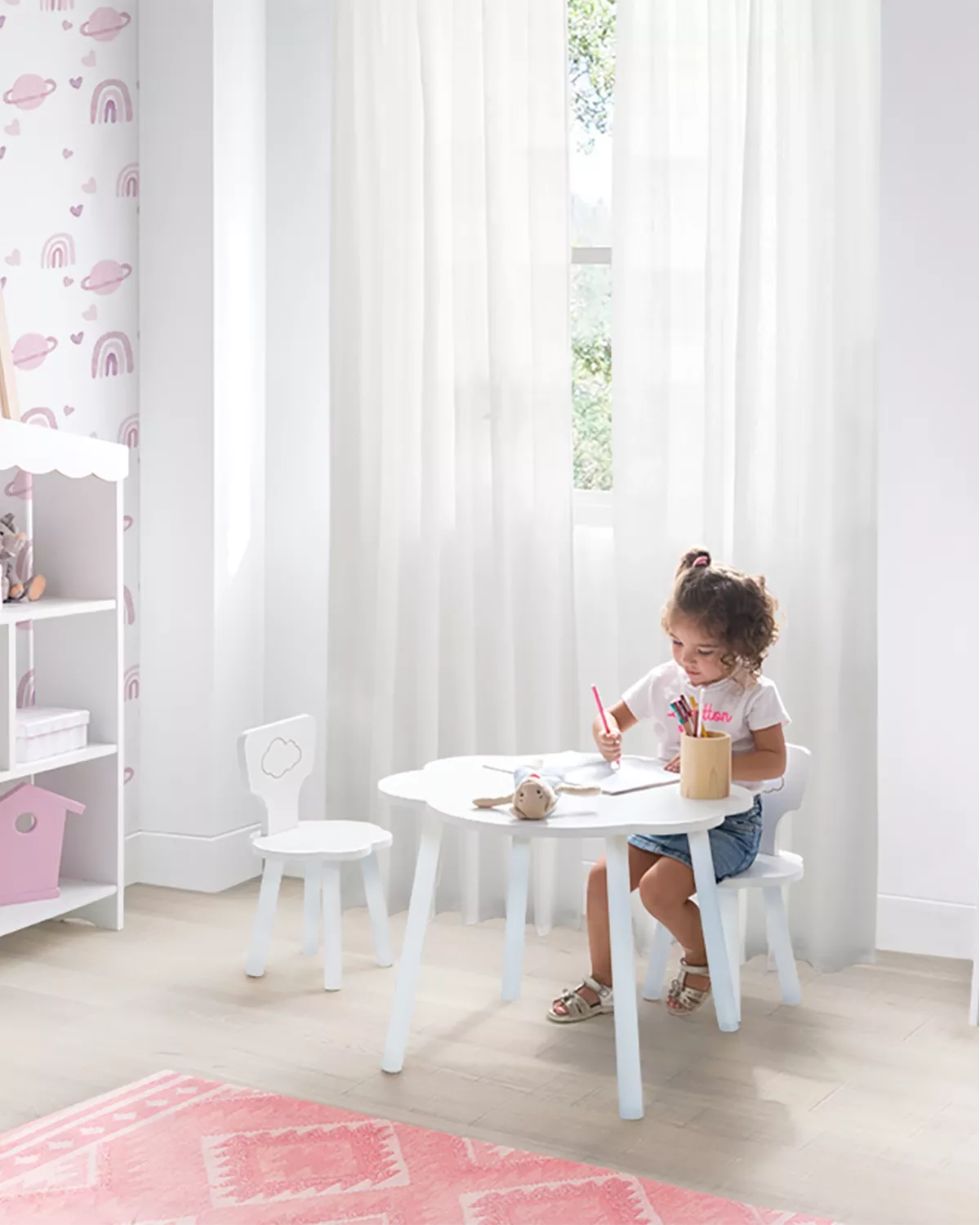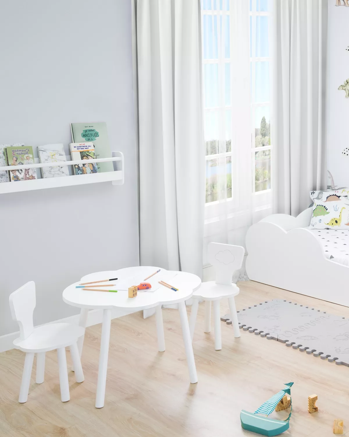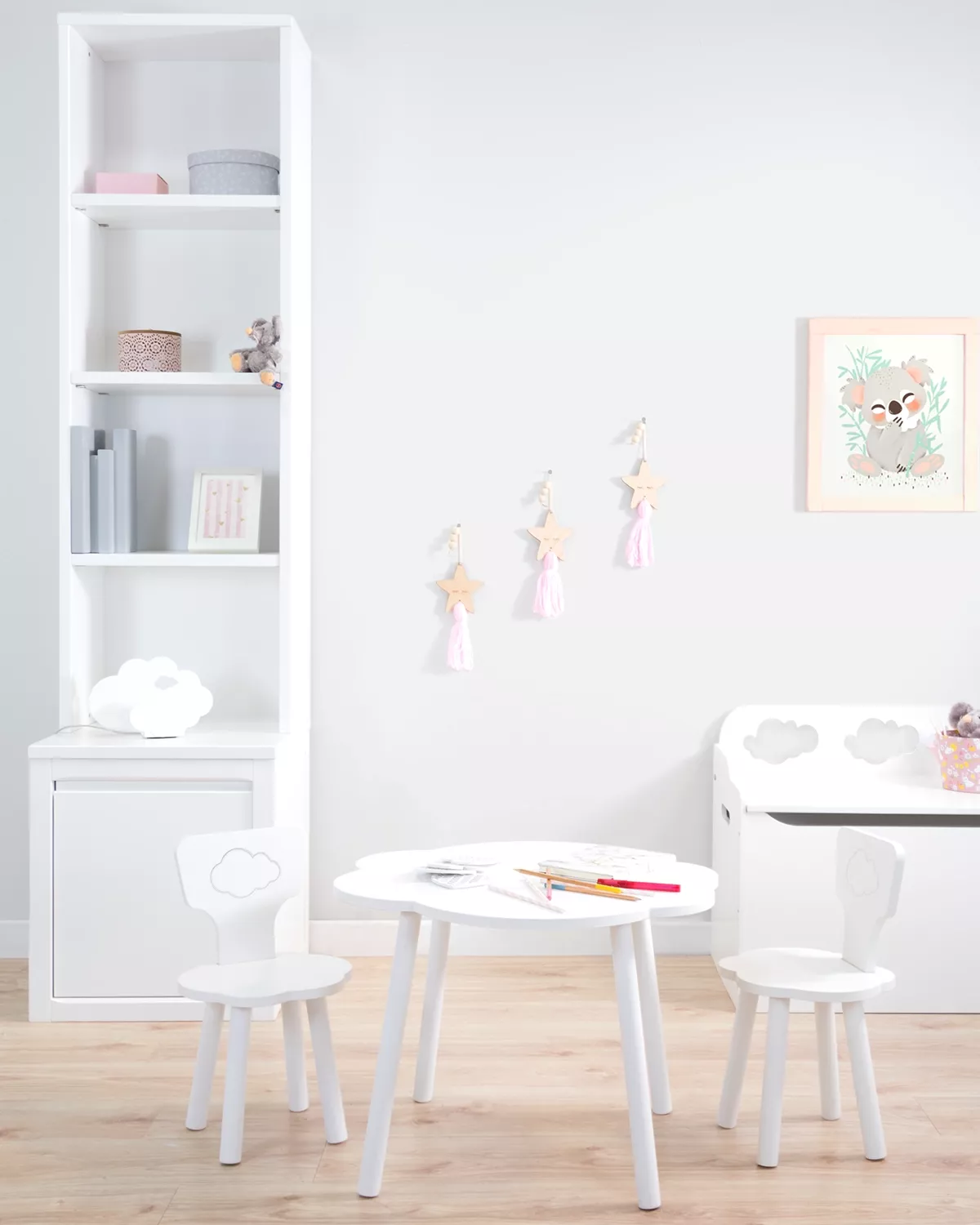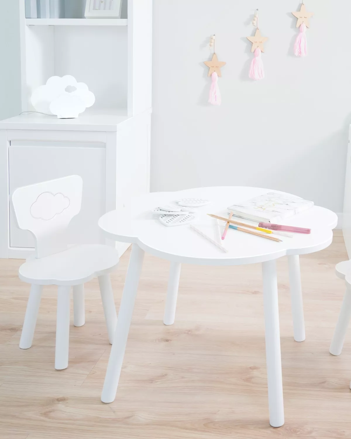 Tavolino con sedie Nuvola questo tavolino della linea Montossori è carinissimo, perfetto per completare una cameretta Montossori, le sedie sono anche a forma di nuvola, molto allegri e divertenti. Creare un ambiente di studio o di creatività è molto più facile con questo tavolino dove i bambini possono fare dei belli disegni, giocare, iniziare a scrivere le prime lettere. Tuttto questo con i vantaggi pedagogici della bassa altezza che gli fa ancora più indipendenti e autonomi. Fabbricato in legno di pino e MDF, materiale forte, rigido e di lunga durata; qualità di materiali e disegno da usufruire per tanti anni.
