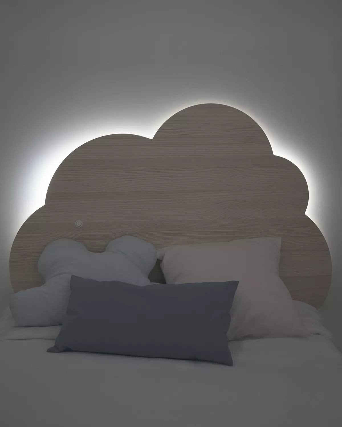 Testiera luminosa Nuvola legno naturale è una testiera molto originale, ha una forma divertente bella e poco comune, in più viene accompagnata da una luce sul retro della testata, ideale per fare addormentarsi i bambini, magari loro hanno ancora paura di dormire con la camera tutta oscura, allora questa testiera é fondamentale perchè ha una luce dolce, perfetta per creare un ambiente tranquilo. Fabbricata in legno di pino e DM, materiale resistente e di lunga durata, una finitura liscia, omogenea e soave, insomma un mobile perfetto per le mamme che vogliano un letto bello e durevole.